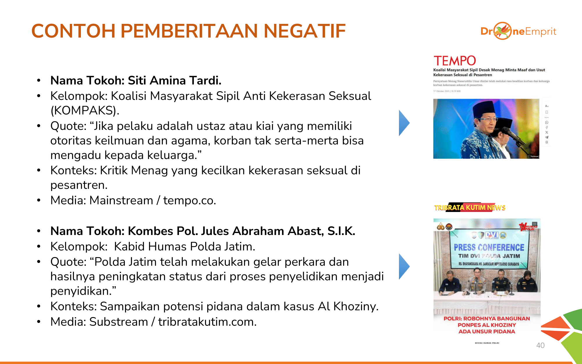 Pemberitaan negatif menyoroti sisi lain. Aktivis masyarakat sipil mengkritik pernyataan Menag yang dianggap mengecilkan isu kekerasan seksual, sementara kepolisian menegaskan adanya potensi pidana dalam kasus ambruknya bangunan Ponpes Al Khoziny.