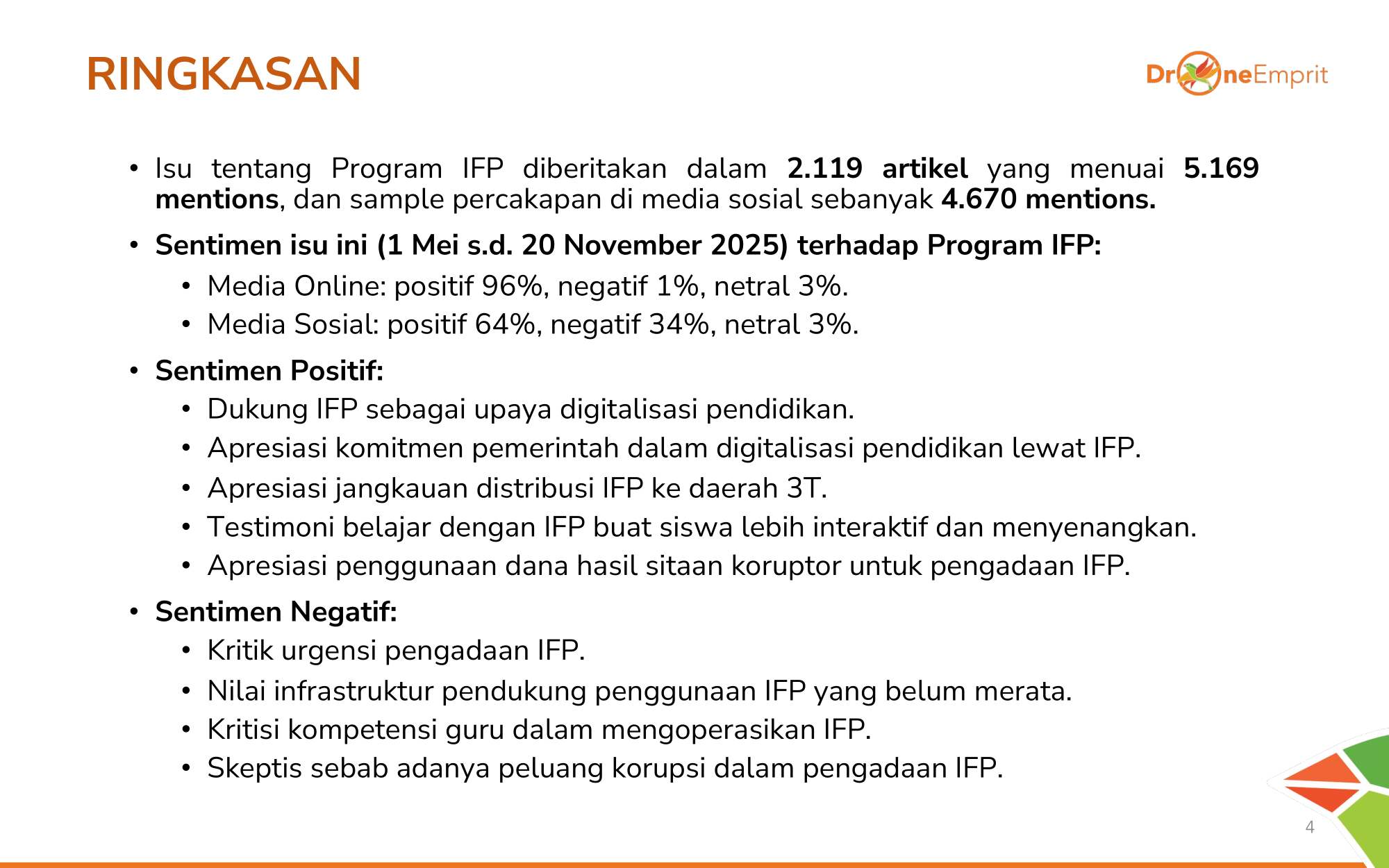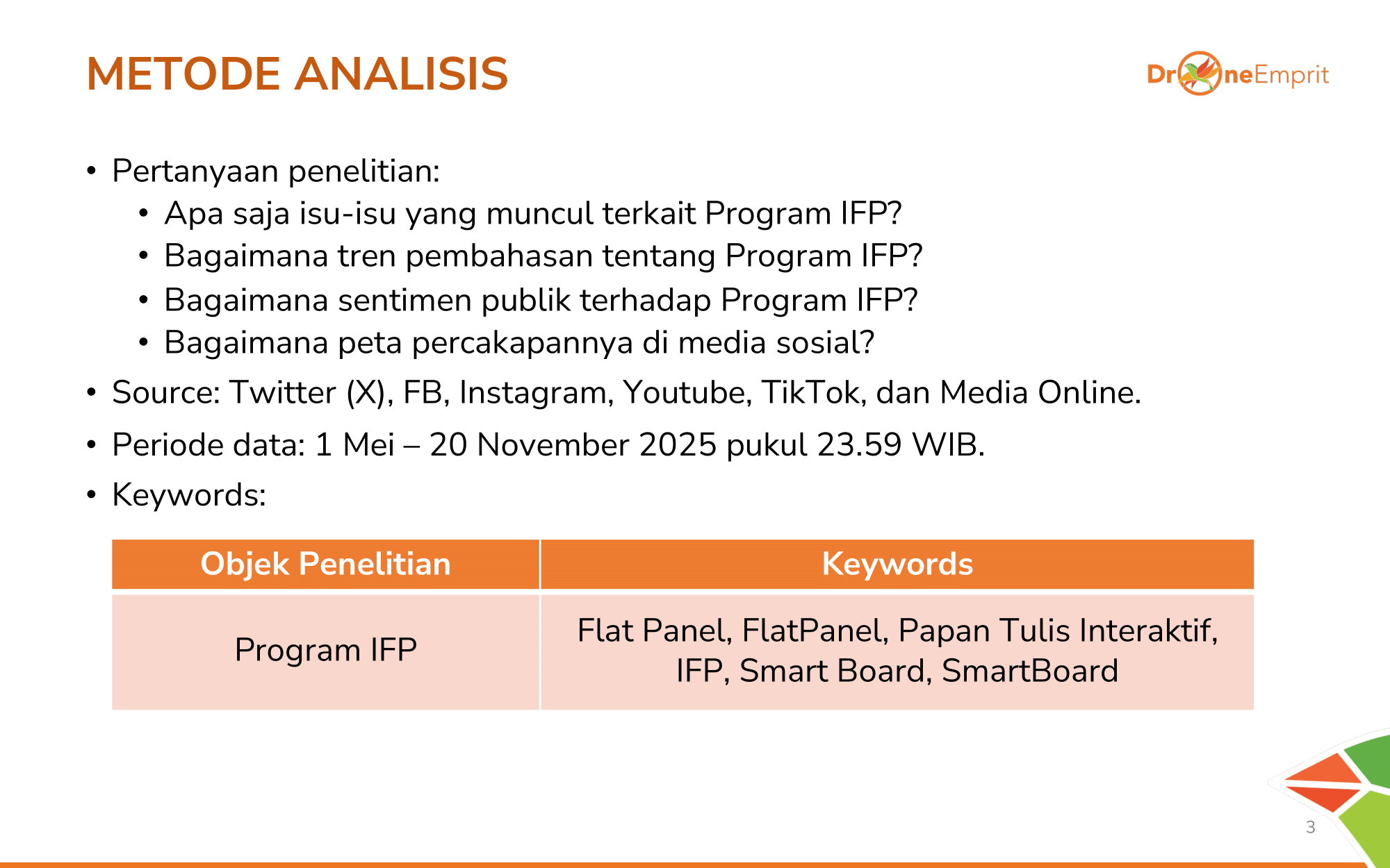 Kami membedah ribuan data dari X, FB, IG, TikTok, YouTube & berita online (1 Mei-20 Nov 2025). Riset fokus pada tren, sentimen, & peta percakapan dengan kata kunci utama seperti "IFP", "Smart Board", hingga "Papan Interaktif".