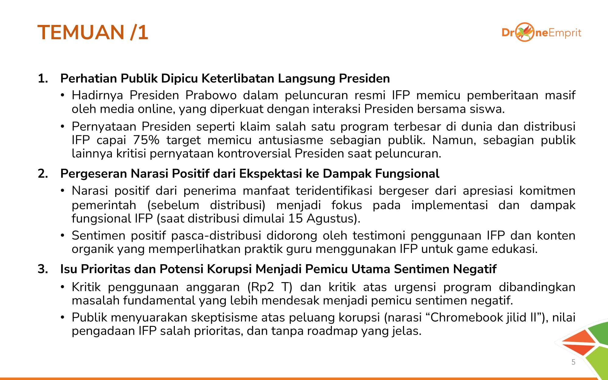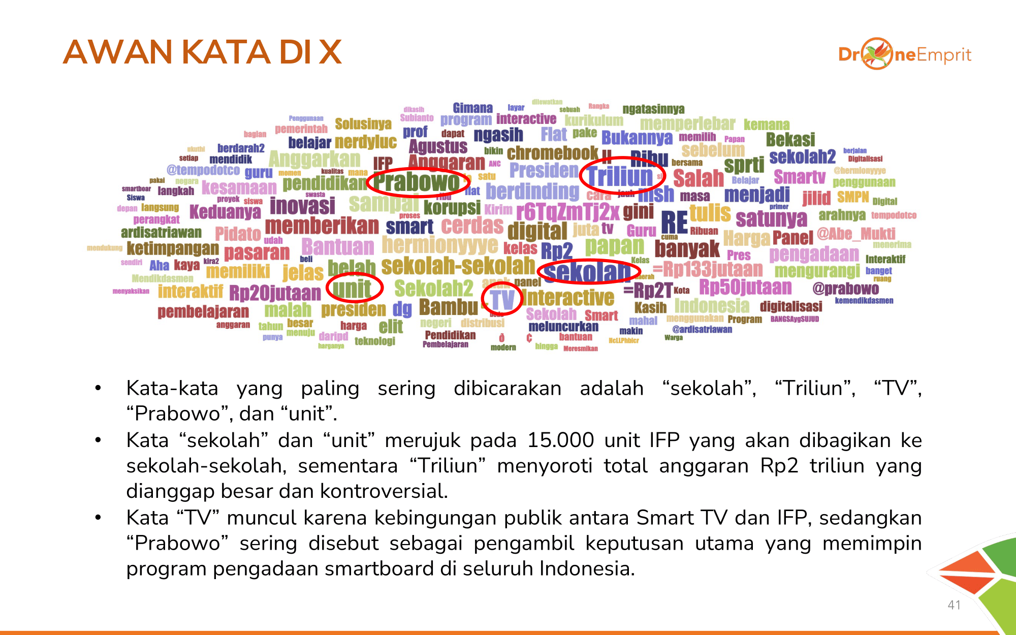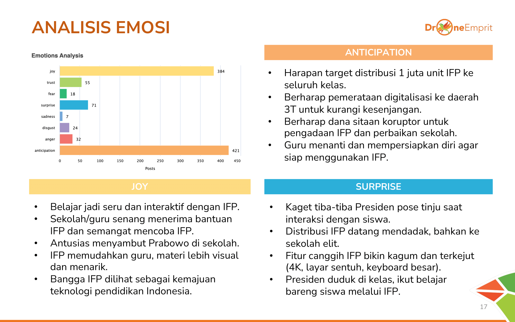 "Anticipation" mendominasi harapan pemerataan ke daerah 3T. "Joy" muncul dari siswa yang menikmati belajar interaktif. Ada juga "Surprise" melihat fitur canggih & gaya santai Presiden saat berinteraksi.