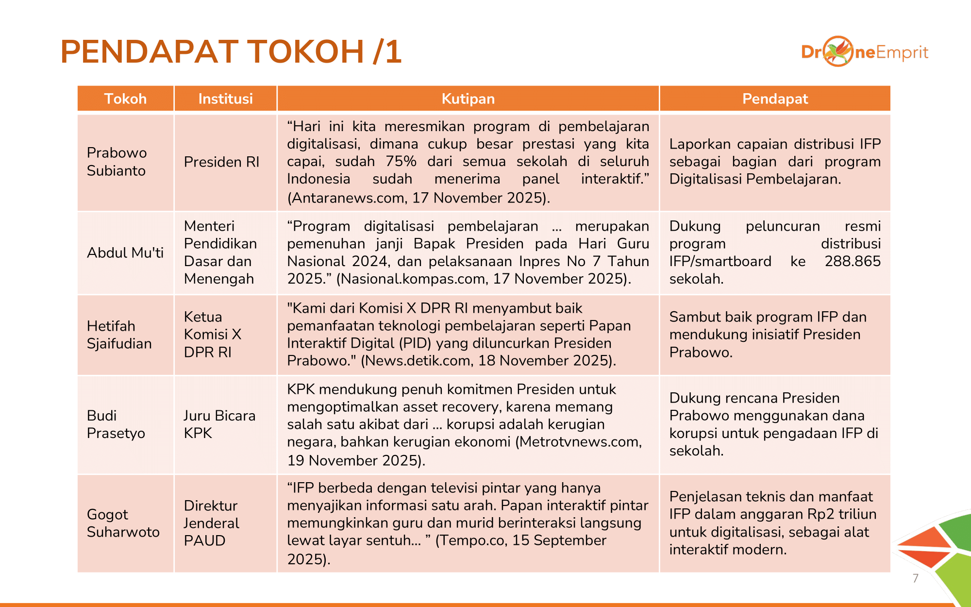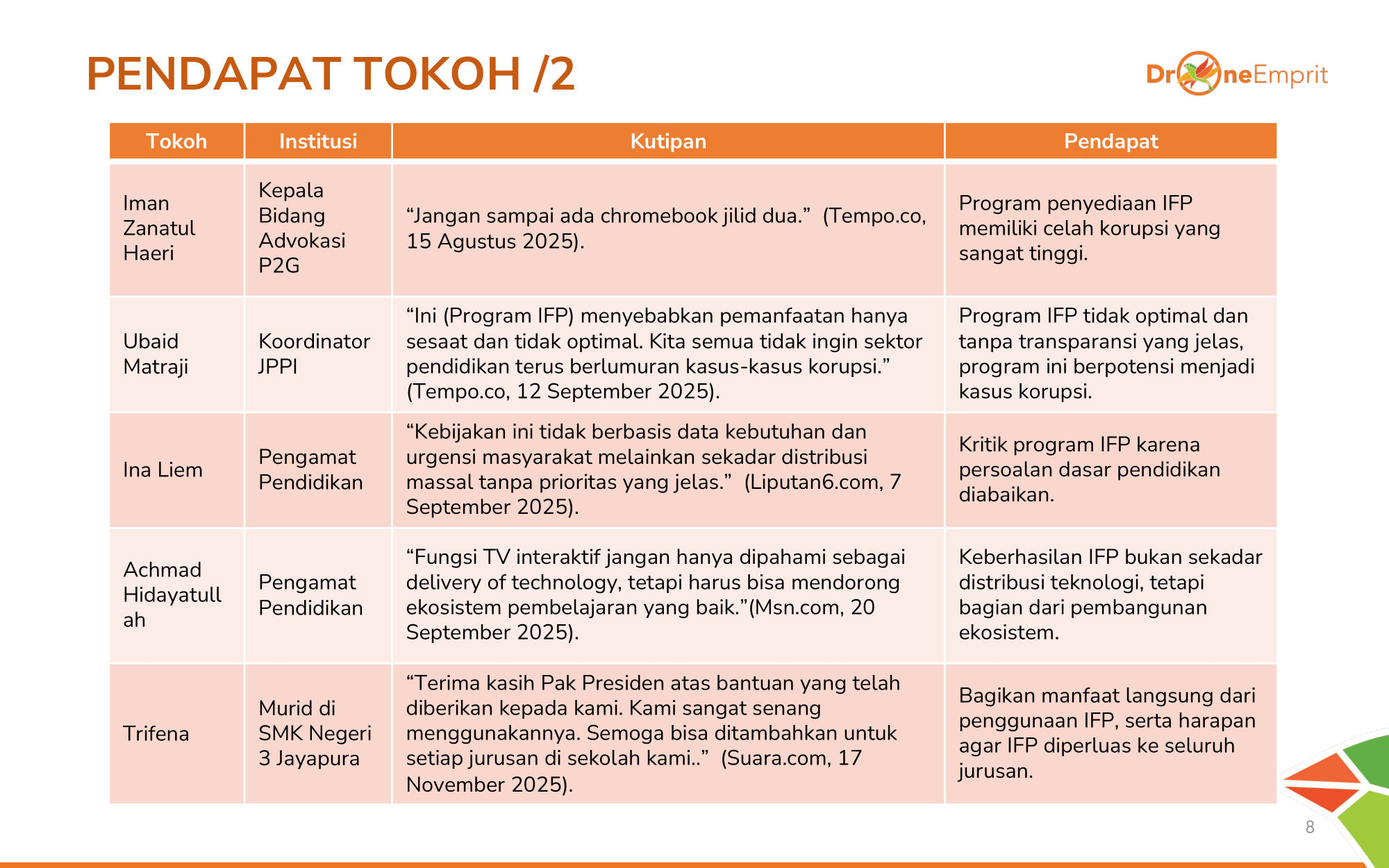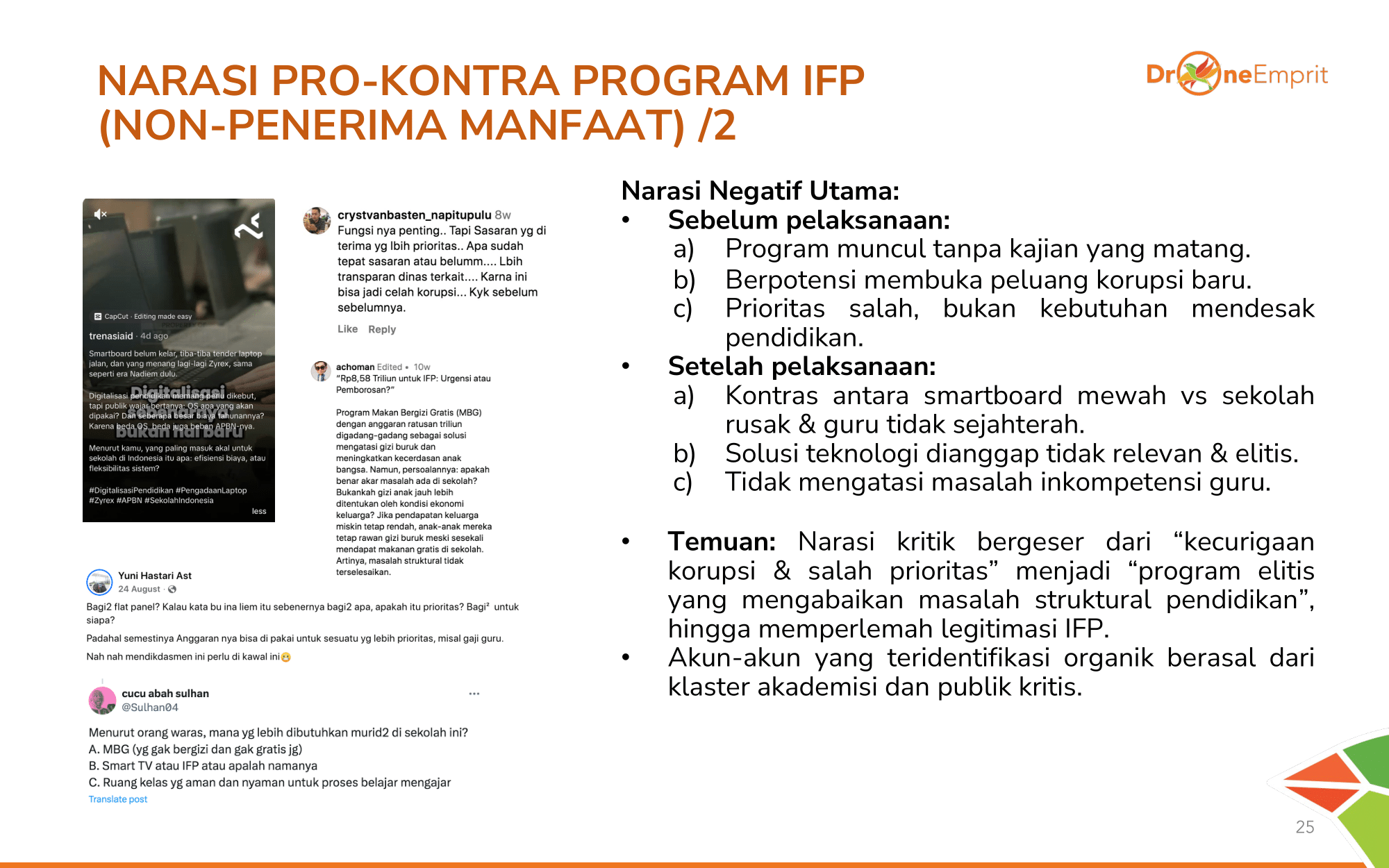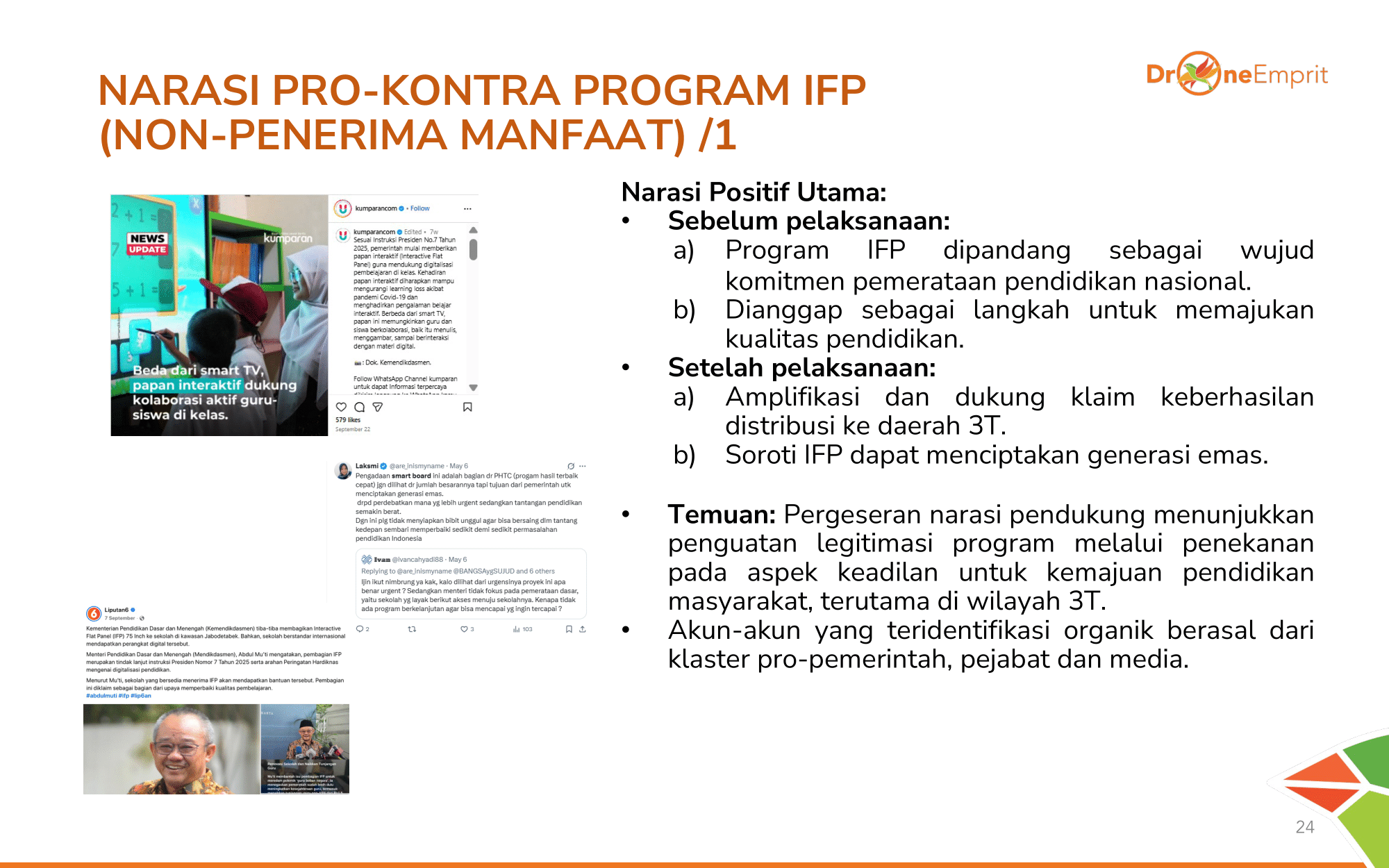 Publik umum yang mendukung program melihat IFP sebagai simbol keadilan pendidikan bagi daerah 3T & investasi SDM. Narasi ini kuat diamplifikasi oleh akun pro-pemerintah & media sebagai bukti kerja nyata.