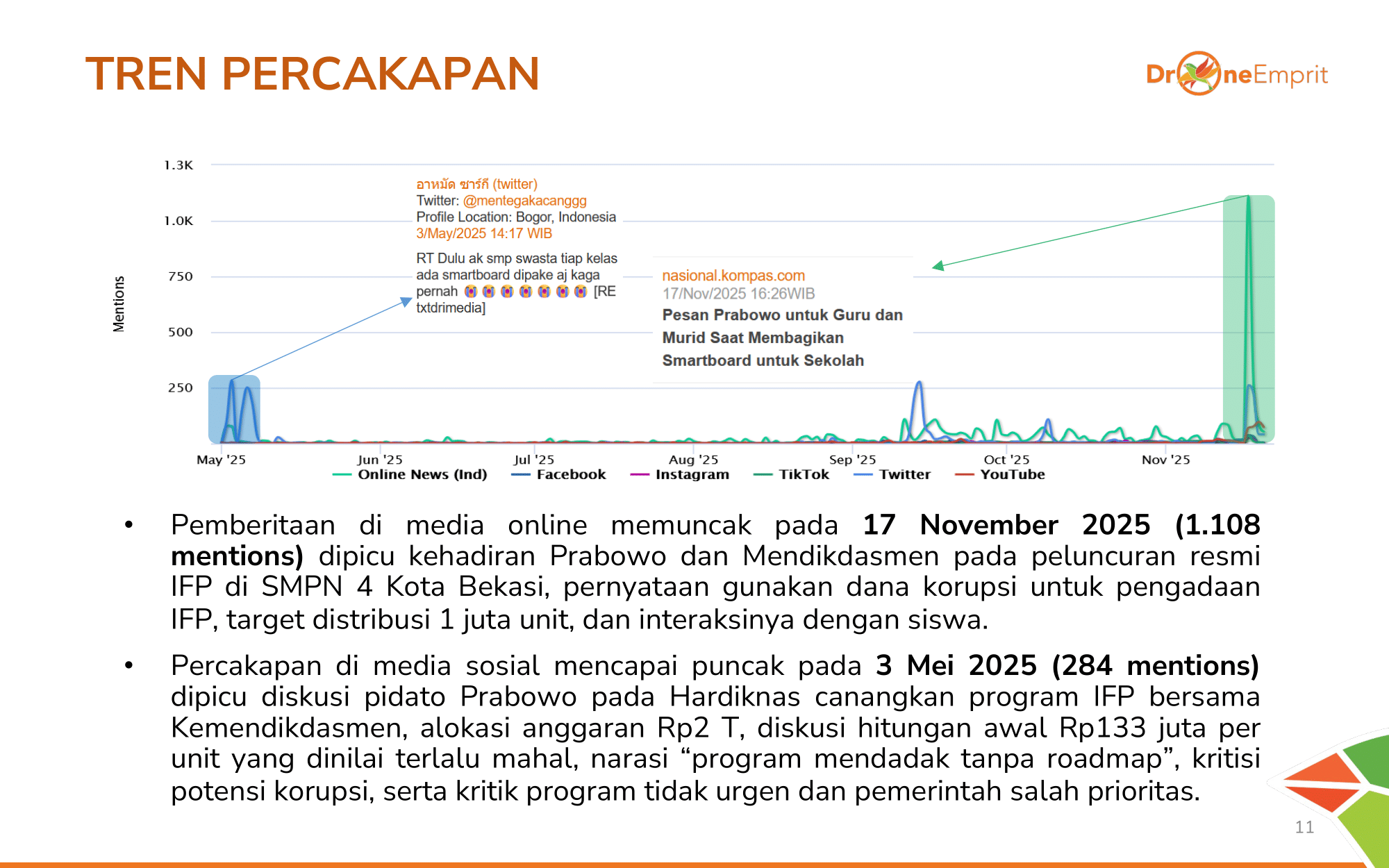 Puncak percakapan terjadi 17 Nov saat peluncuran resmi di Bekasi. Sebelumnya, lonjakan terjadi 3 Mei pasca pidato Hardiknas. Pemicunya selalu dua sisi: antusiasme program baru vs kritik anggaran yang dinilai mahal.