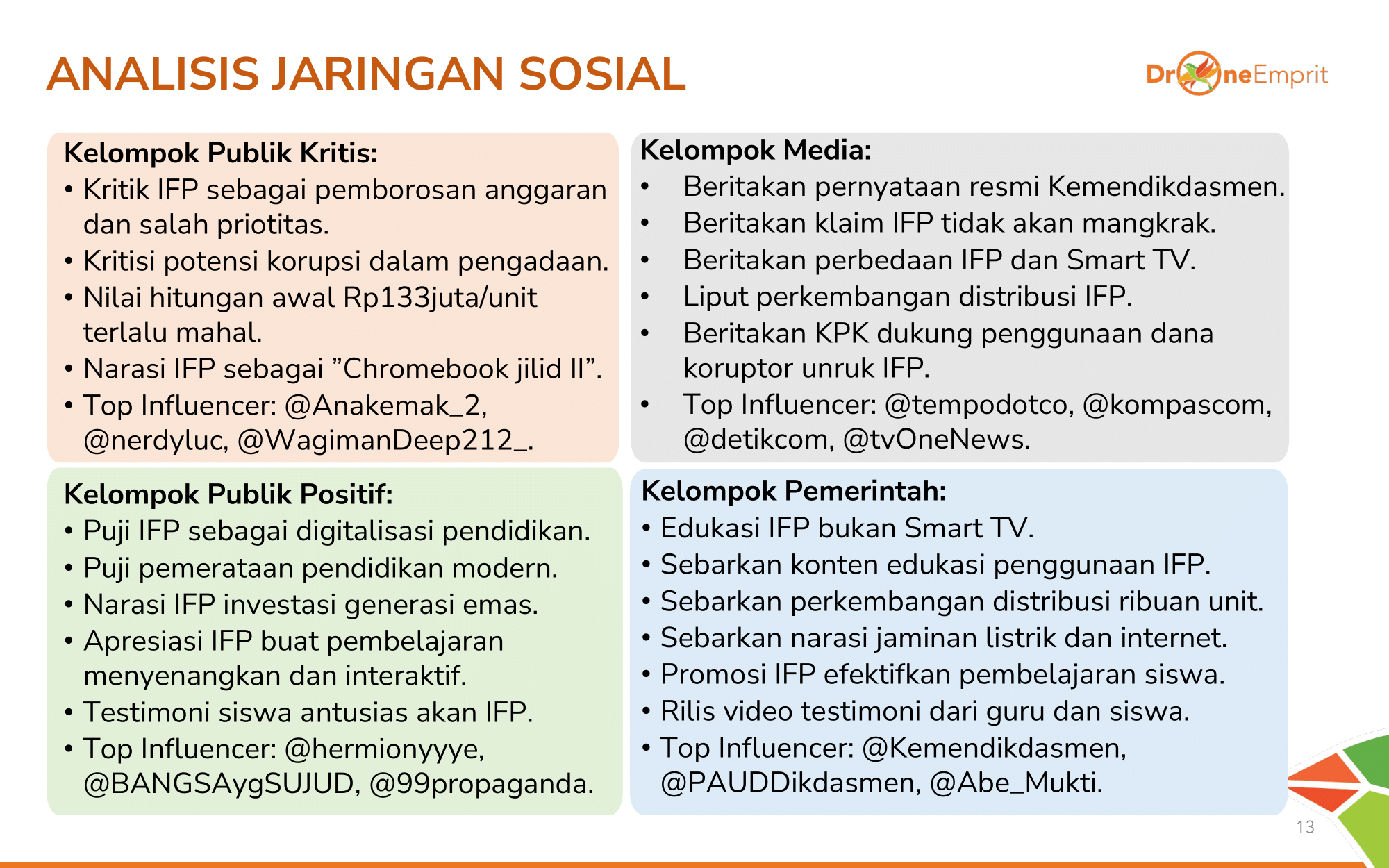Klaster terbentuk jelas. Influencer kritis menyoroti anggaran & prioritas, sementara akun positif fokus pada testimoni manfaat belajar. Akun resmi kementerian & media aktif melawan misinformasi.