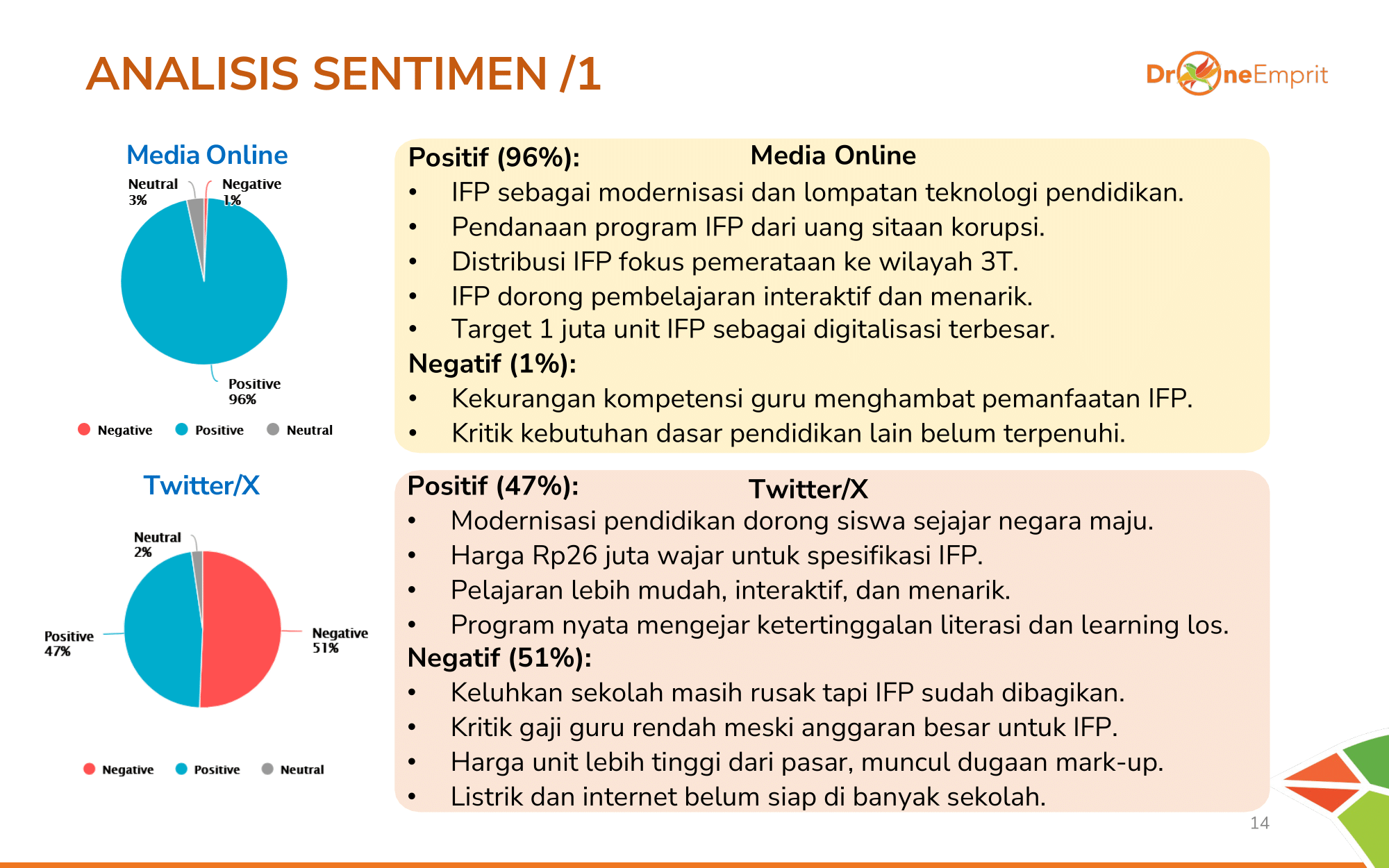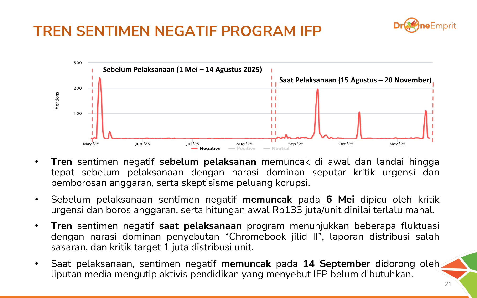 Awal program panen kritik soal harga unit mahal. Saat pelaksanaan, sentimen negatif naik turun dipicu laporan distribusi salah sasaran & narasi "belum butuh" dari pengamat pendidikan.
