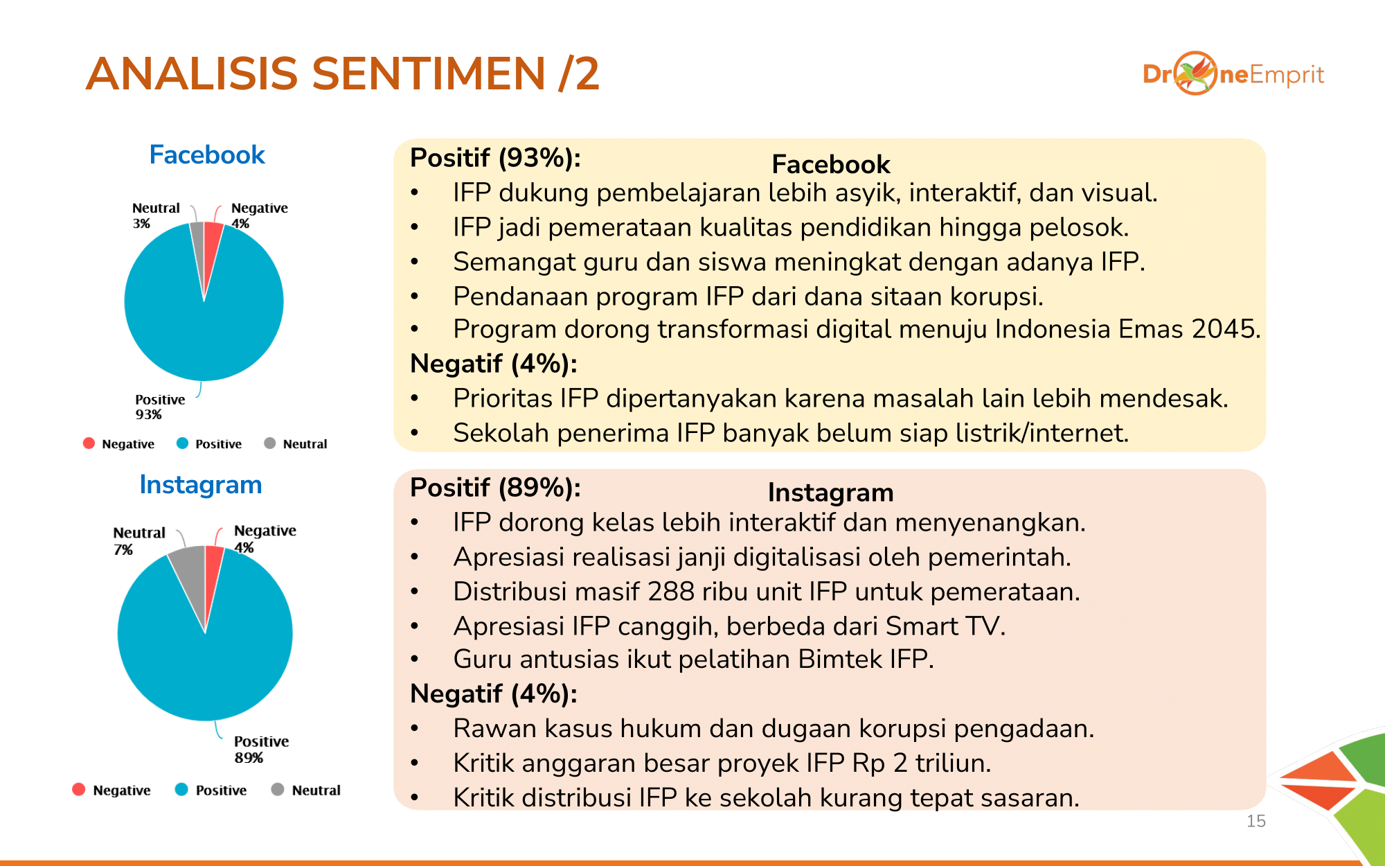 Berbeda dengan X, Facebook (93%) & Instagram (89%) dibanjiri sentimen positif. Publik di sini lebih apresiatif terhadap visual pembelajaran interaktif & pemerataan ke desa, meski ada sedikit kritik salah sasaran.