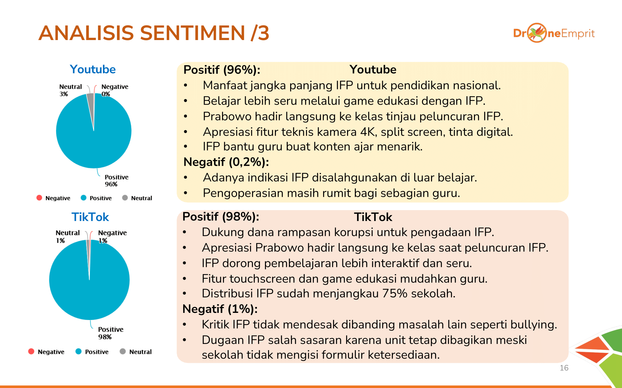 YouTube & TikTok jadi lumbung dukungan tertinggi (>96%). Konten visual fitur canggih IFP & momen Presiden di kelas sukses merebut hati netizen muda. Isu negatif sangat minim di platform berbasis video ini.