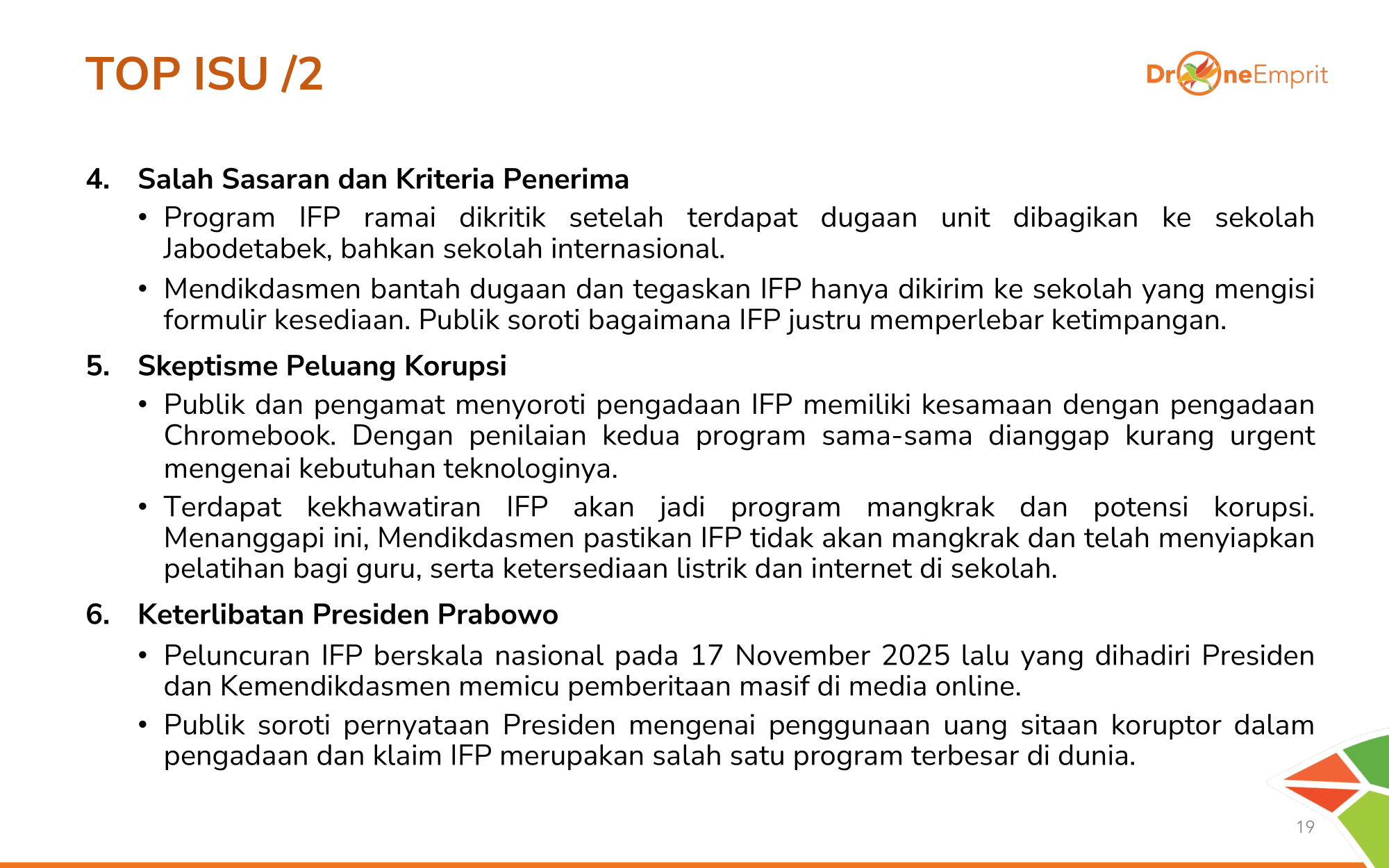 Isu distribusi salah sasaran ke sekolah elite sempat viral. Skeptisisme korupsi ala "Chromebook" juga membayangi. Namun, narasi penggunaan uang sitaan koruptor oleh Presiden sedikit meredakan ketegangan ini.