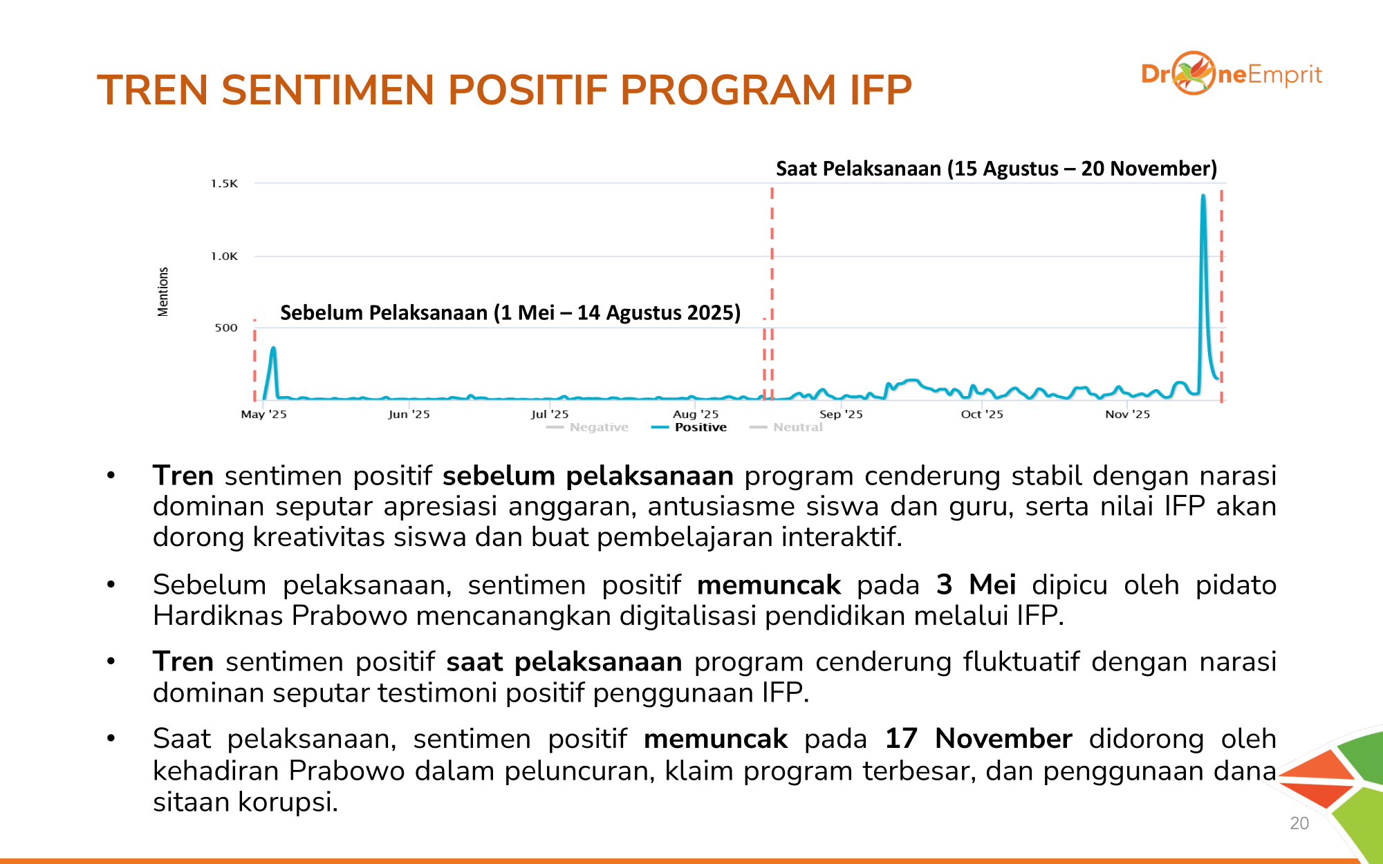 Sebelum peluncuran, sentimen positif stabil berisi harapan. Pasca distribusi, tren fluktuatif namun melonjak tajam saat peluncuran resmi 17 Nov, didorong testimoni nyata penggunaan IFP di kelas-kelas.
