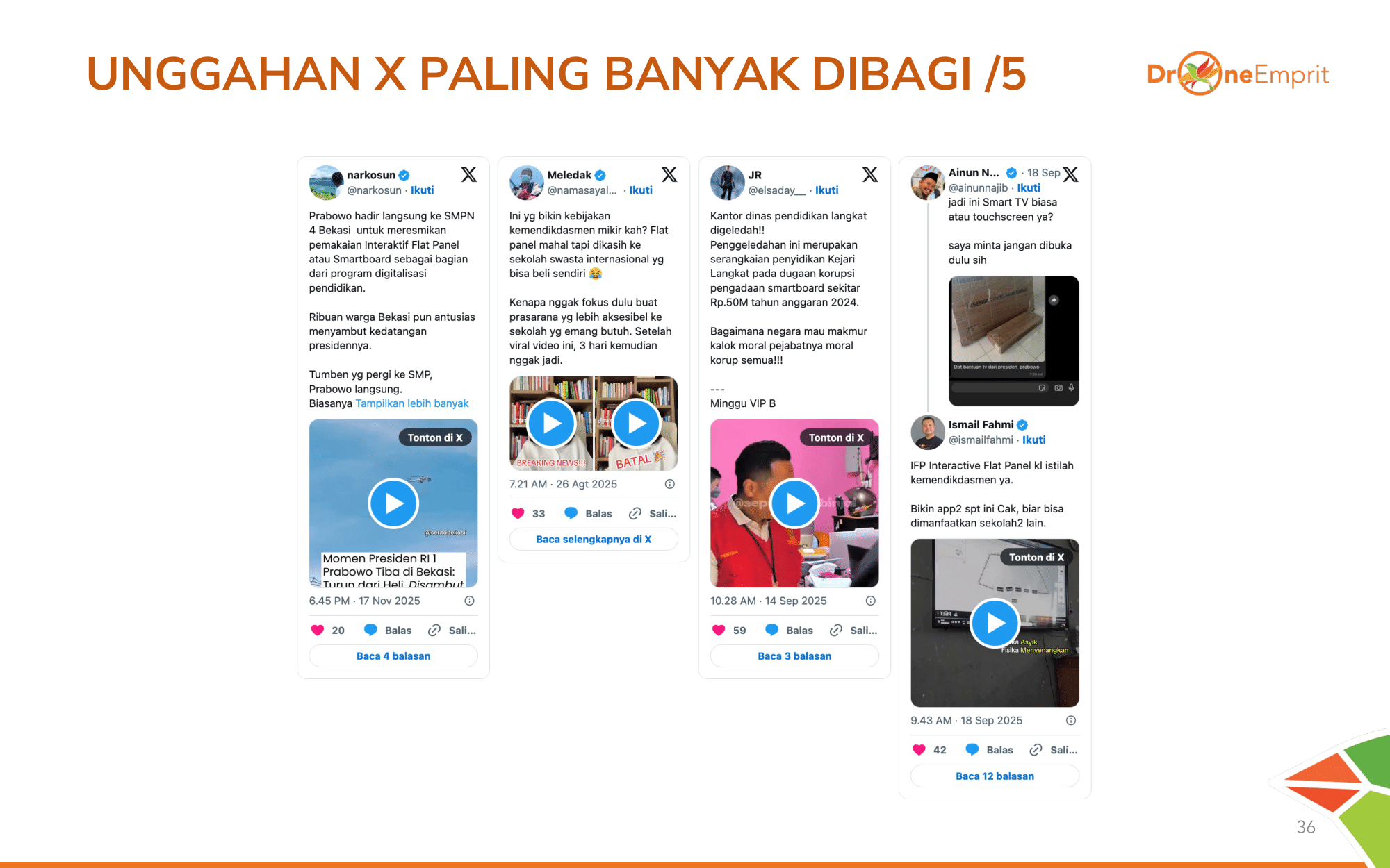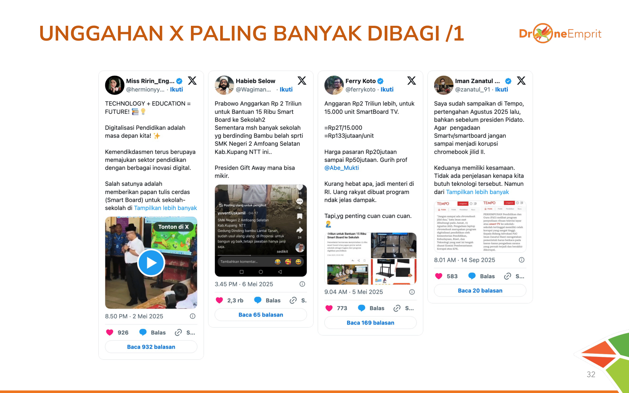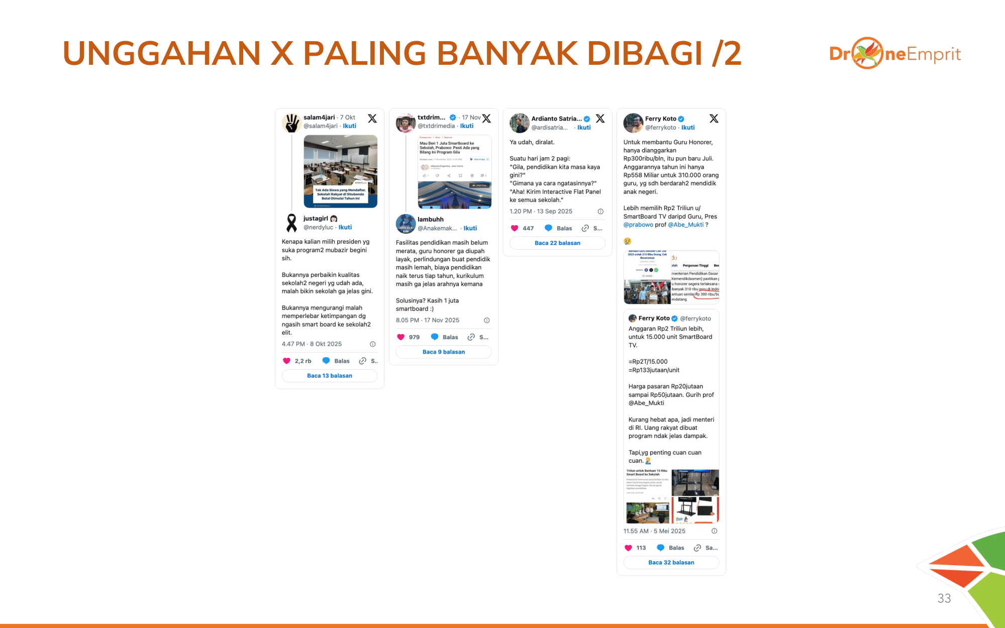 Sindiran keras soal "gaji guru honorer vs harga smartboard" dan meme pengambilan kebijakan mendadak mendominasi share. Publik kritis menuntut perbaikan kesejahteraan guru dulu.