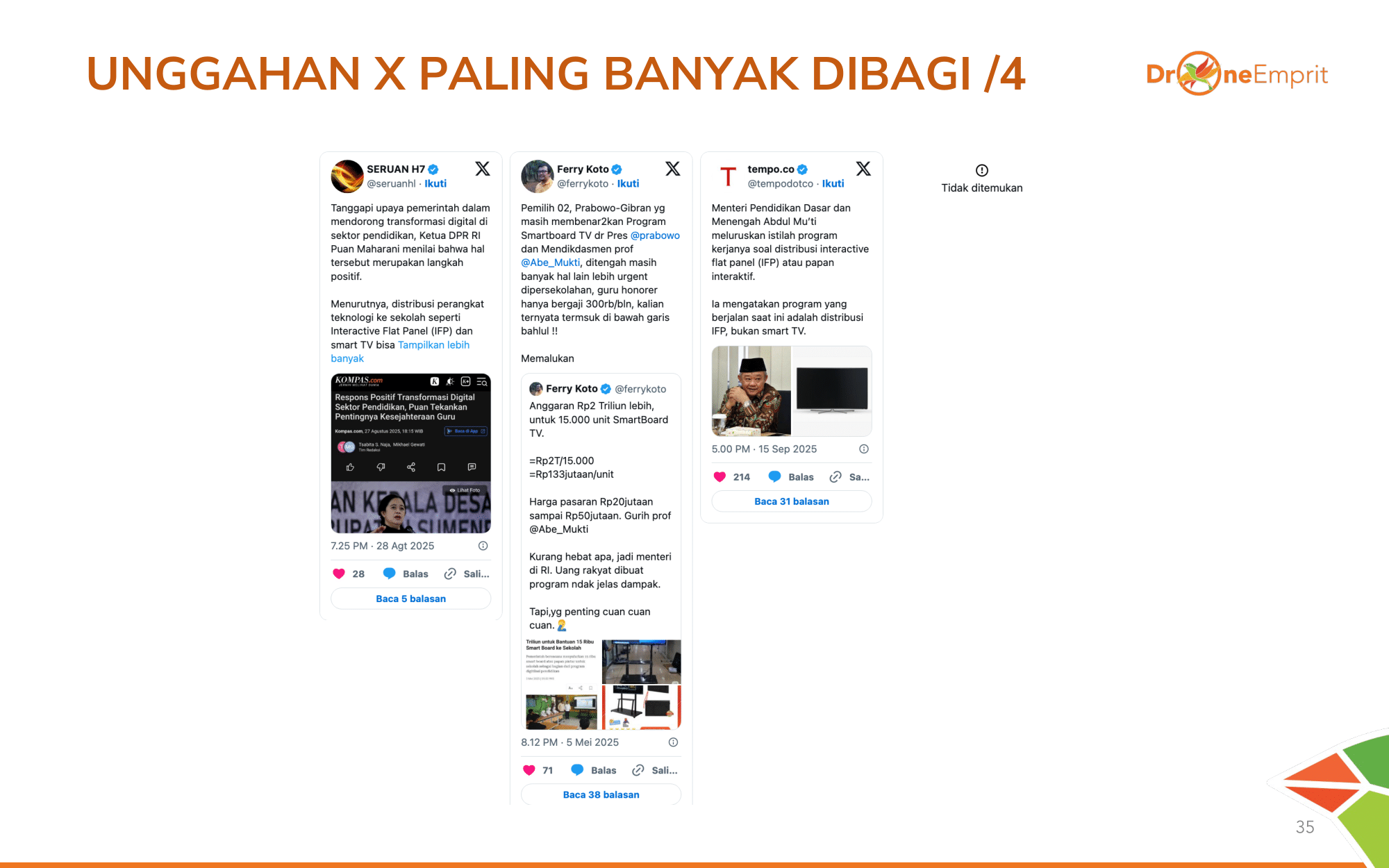 Pertarungan narasi terlihat dari tweet viral ini. Ada yang memuja "Masa Depan", tapi viral juga foto sekolah bambu yang dikontraskan dengan harga smartboard. Isu "Chromebook Jilid II" juga mencuat.