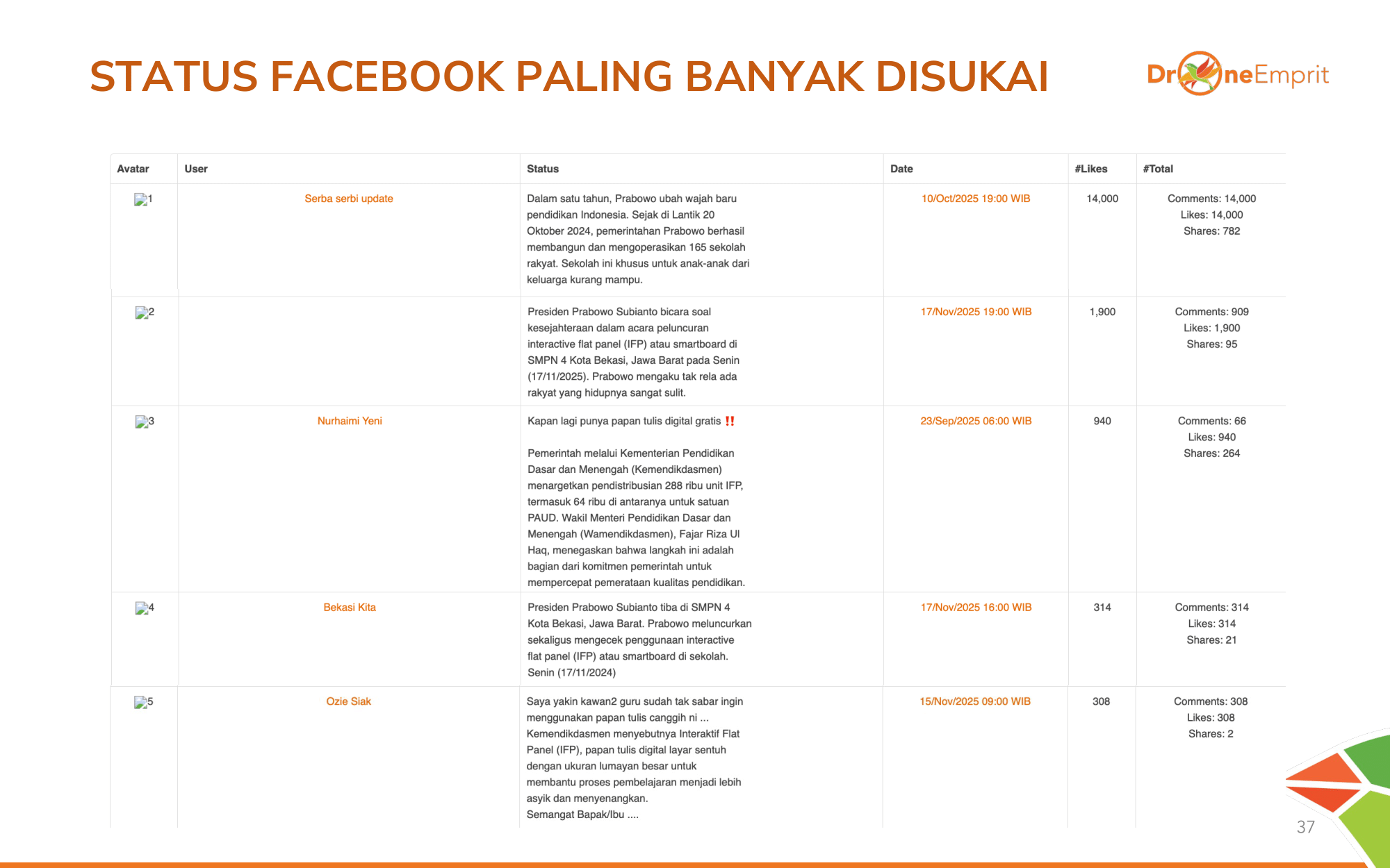 Narasi keberhasilan 1 tahun pemerintahan Prabowo (renovasi sekolah + smartboard) panen 14 ribu likes! Di FB, IFP dilihat sebagai paket lengkap perbaikan pendidikan, bukan program parsial.