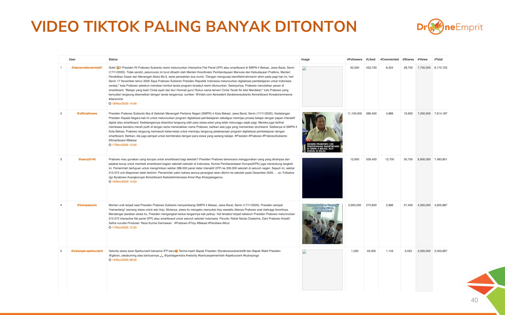 Kreator TikTok & akun berita sukses memviralkan momen peluncuran IFP. Narasi "uang korupsi untuk sekolah" sangat laku & mendulang jutaan views positif di sini.