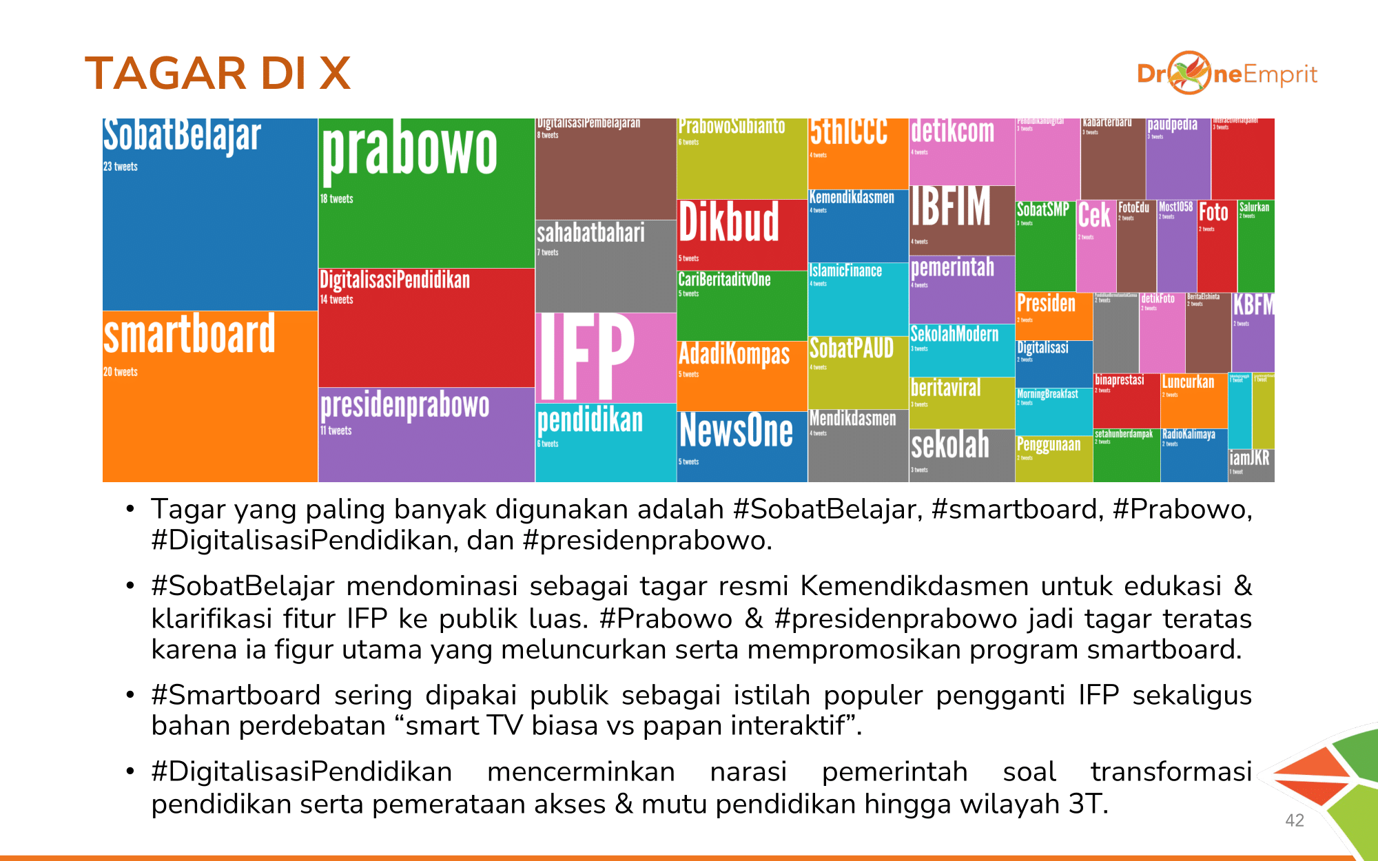 #SobatBelajar jadi andalan pemerintah untuk edukasi fitur. Sementara #Smartboard jadi tagar umum netizen. Menariknya, tagar #Prabowo & #DigitalisasiPendidikan bersaing ketat sebagai identitas program ini.
