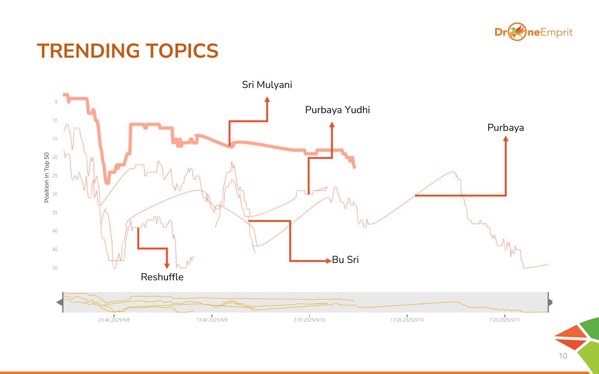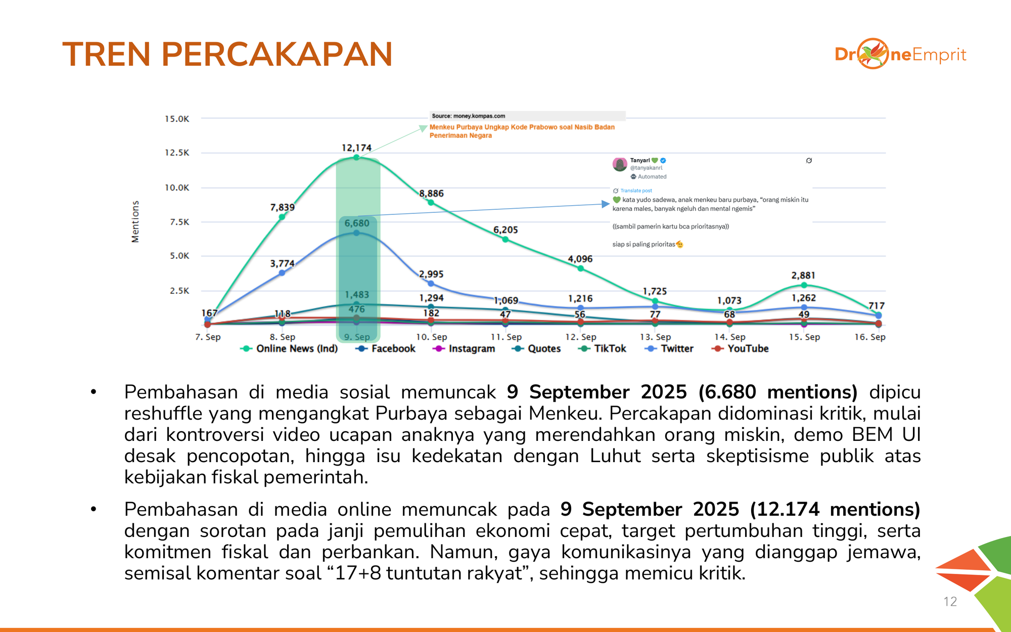 Puncak percakapan terjadi serentak pada 9 September, didorong oleh pelantikan Purbaya, kontroversi pernyataan, & janji pemulihan ekonomi.