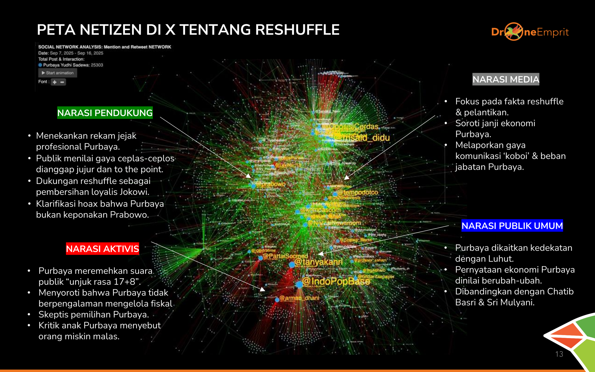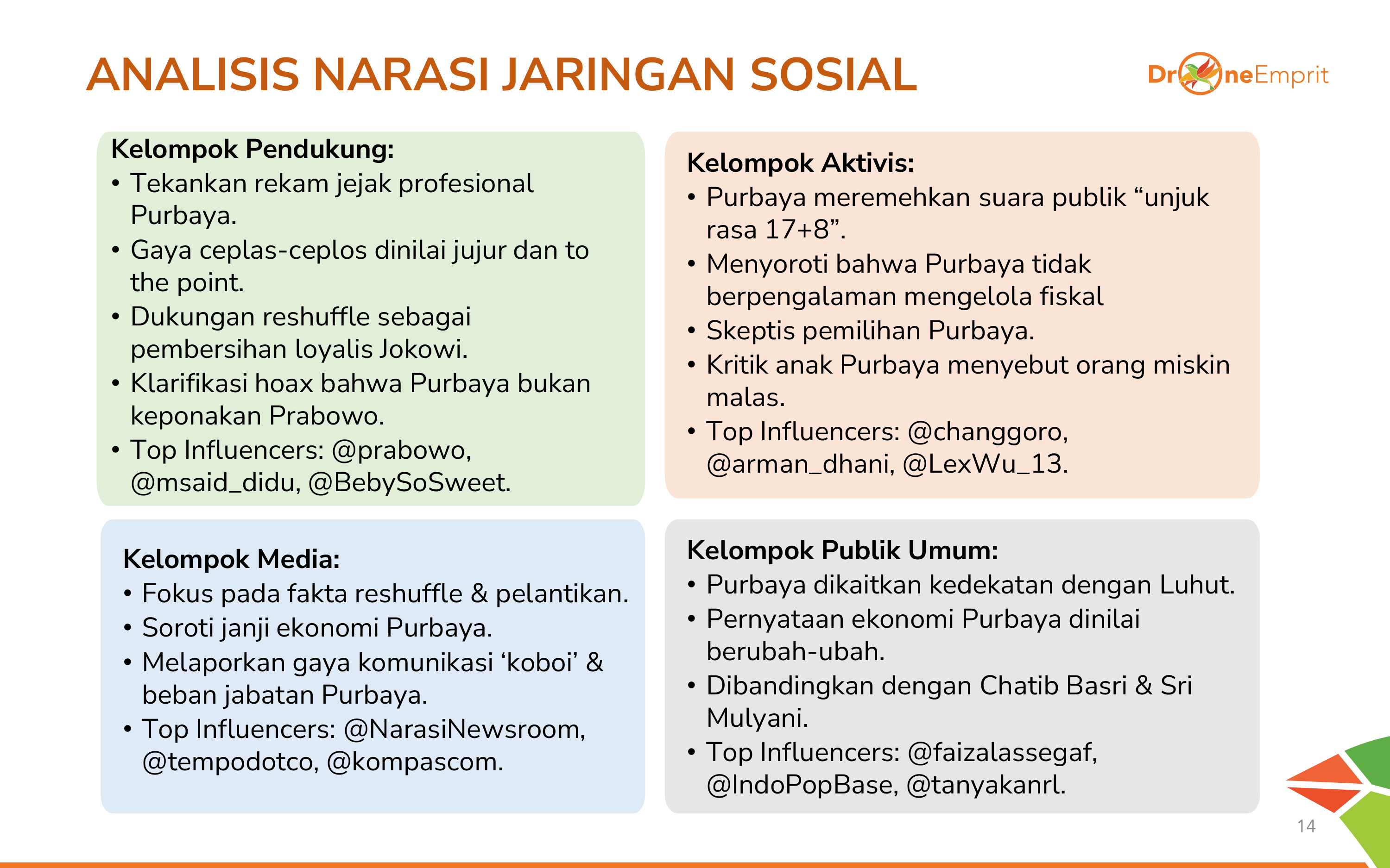 Di X, percakapan terpetakan dalam empat kelompok: media, aktivis yang kritis, publik umum yang skeptis, serta kelompok pendukung Purbaya.