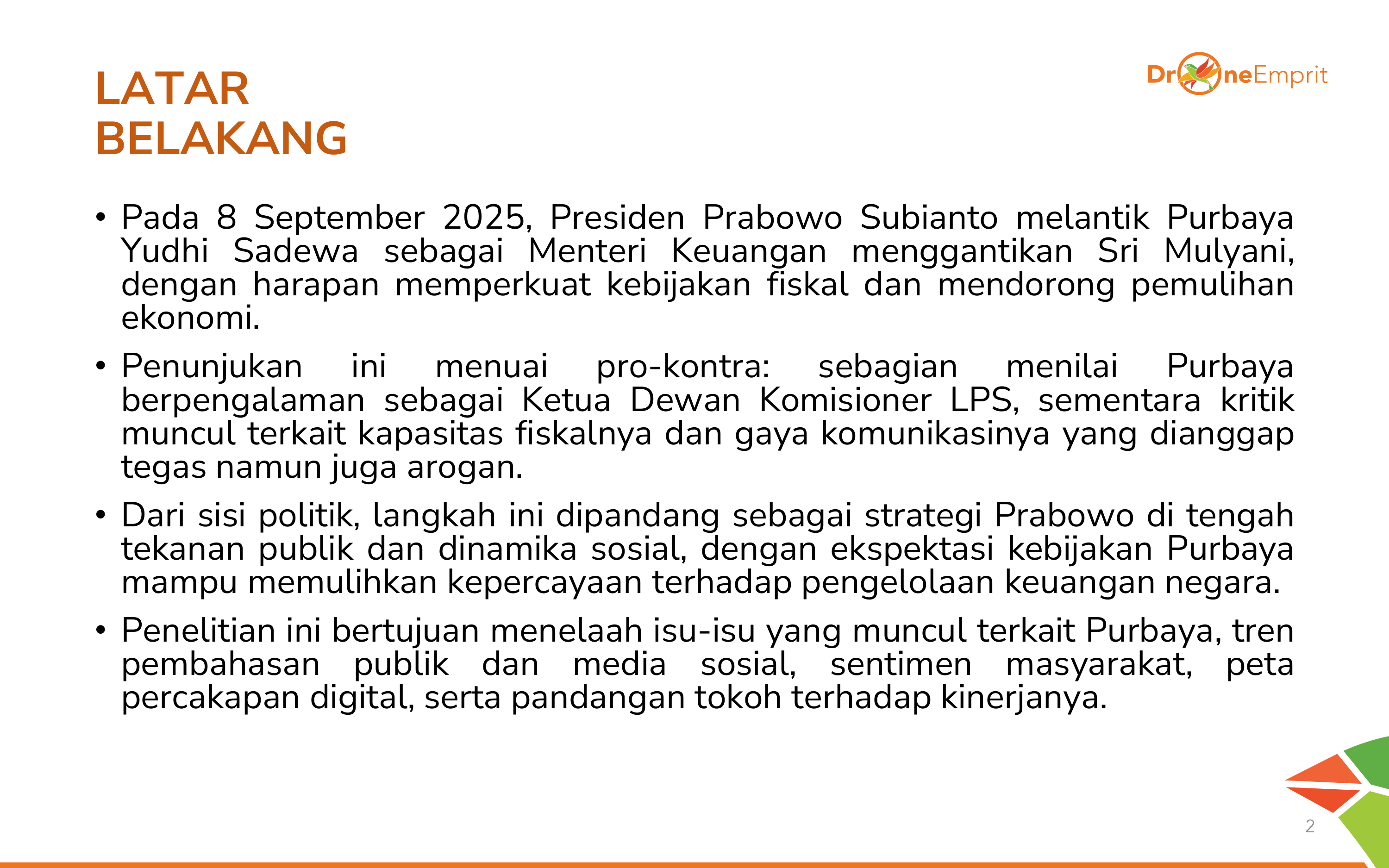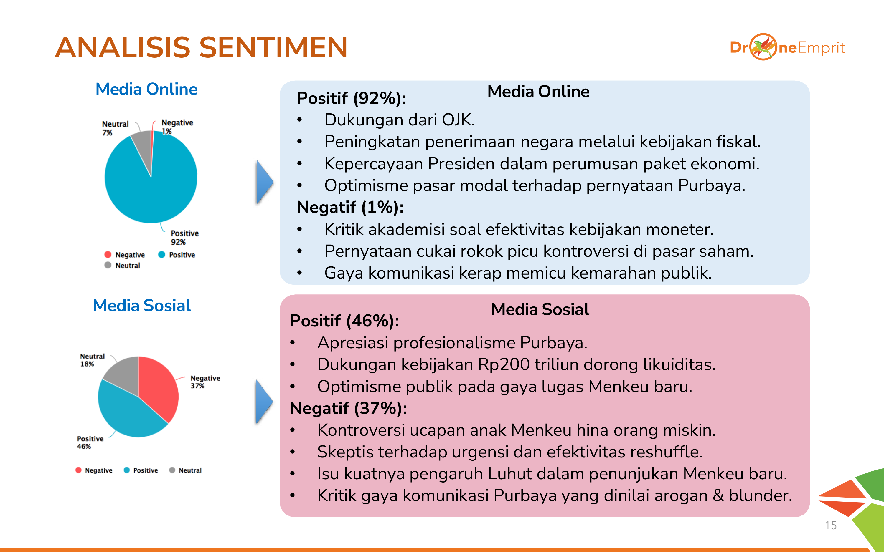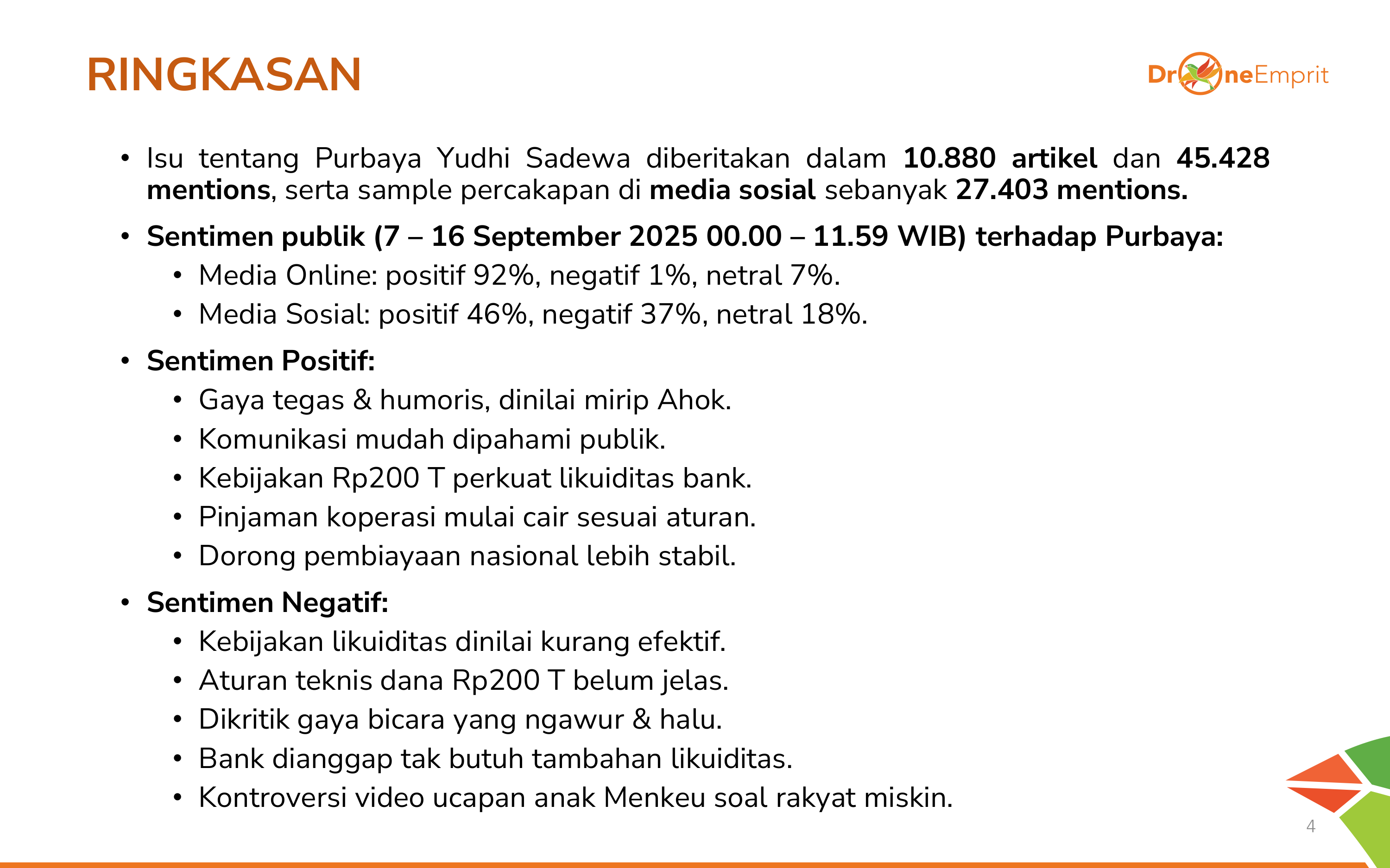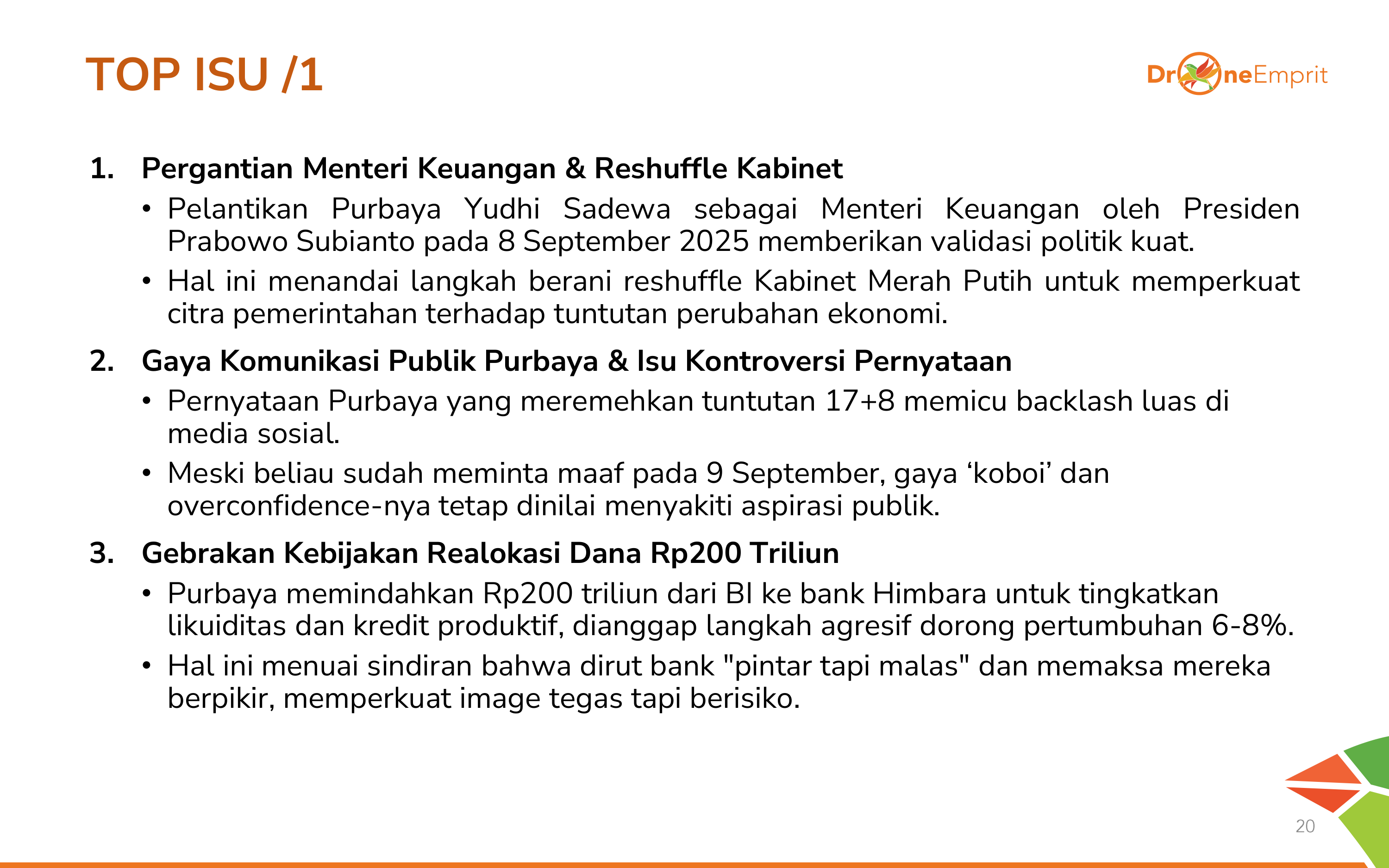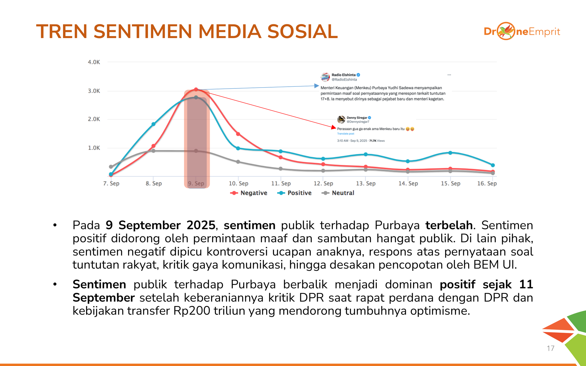 Di medsos, sentimen awalnya negatif karena kontroversi, namun berbalik positif sejak 11 Sep. Ini didorong oleh kritik Purbaya ke DPR & gebrakan dana Rp200 T.