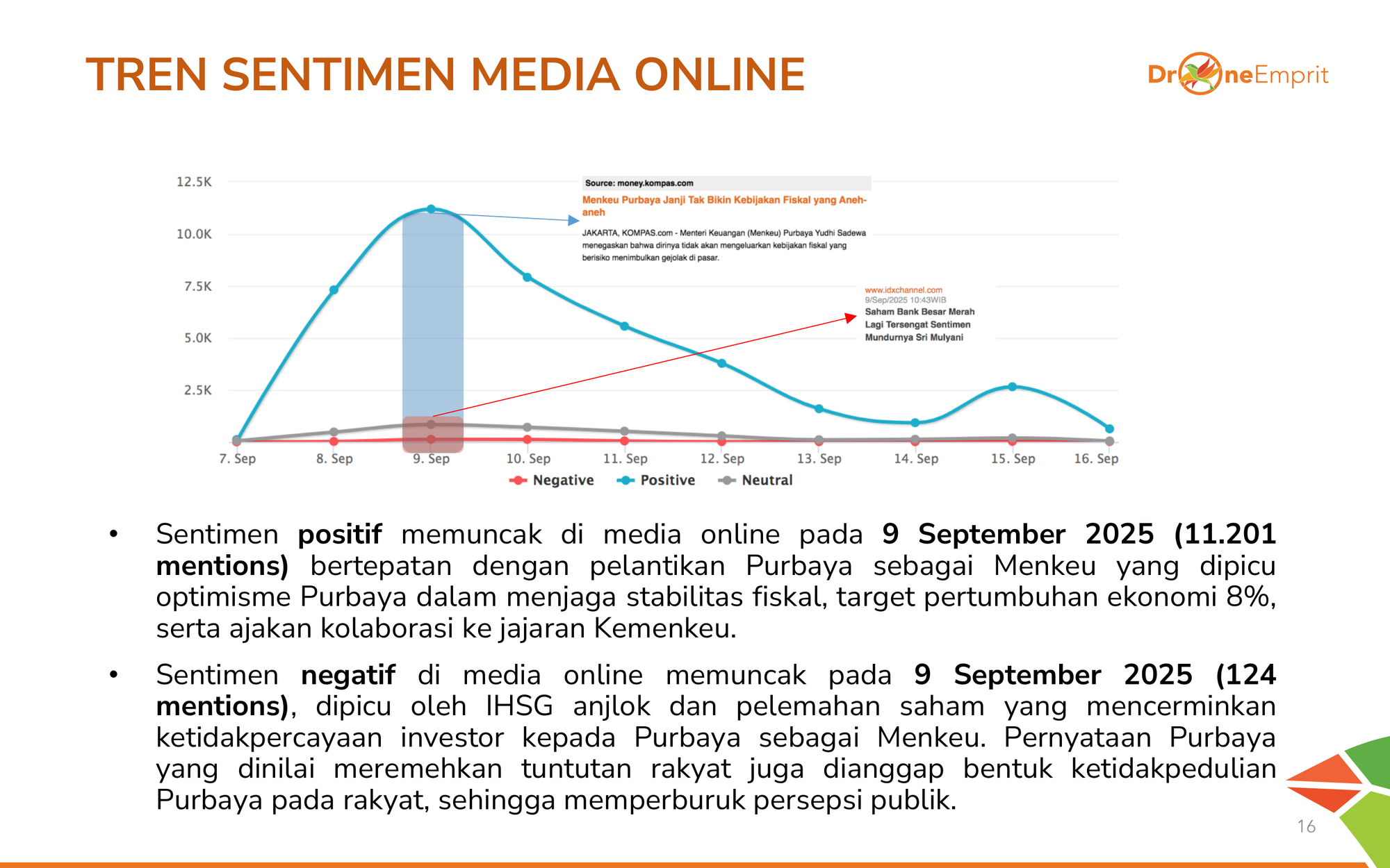 Sentimen positif di media online memuncak pada 9 Sep, didorong oleh optimisme Purbaya. Di saat yang sama, sentimen negatif juga memuncak akibat anjloknya IHSG.