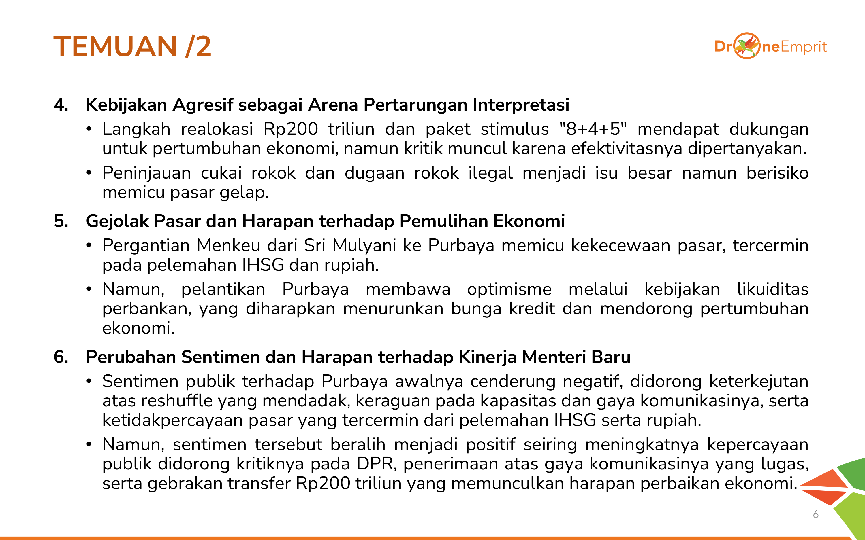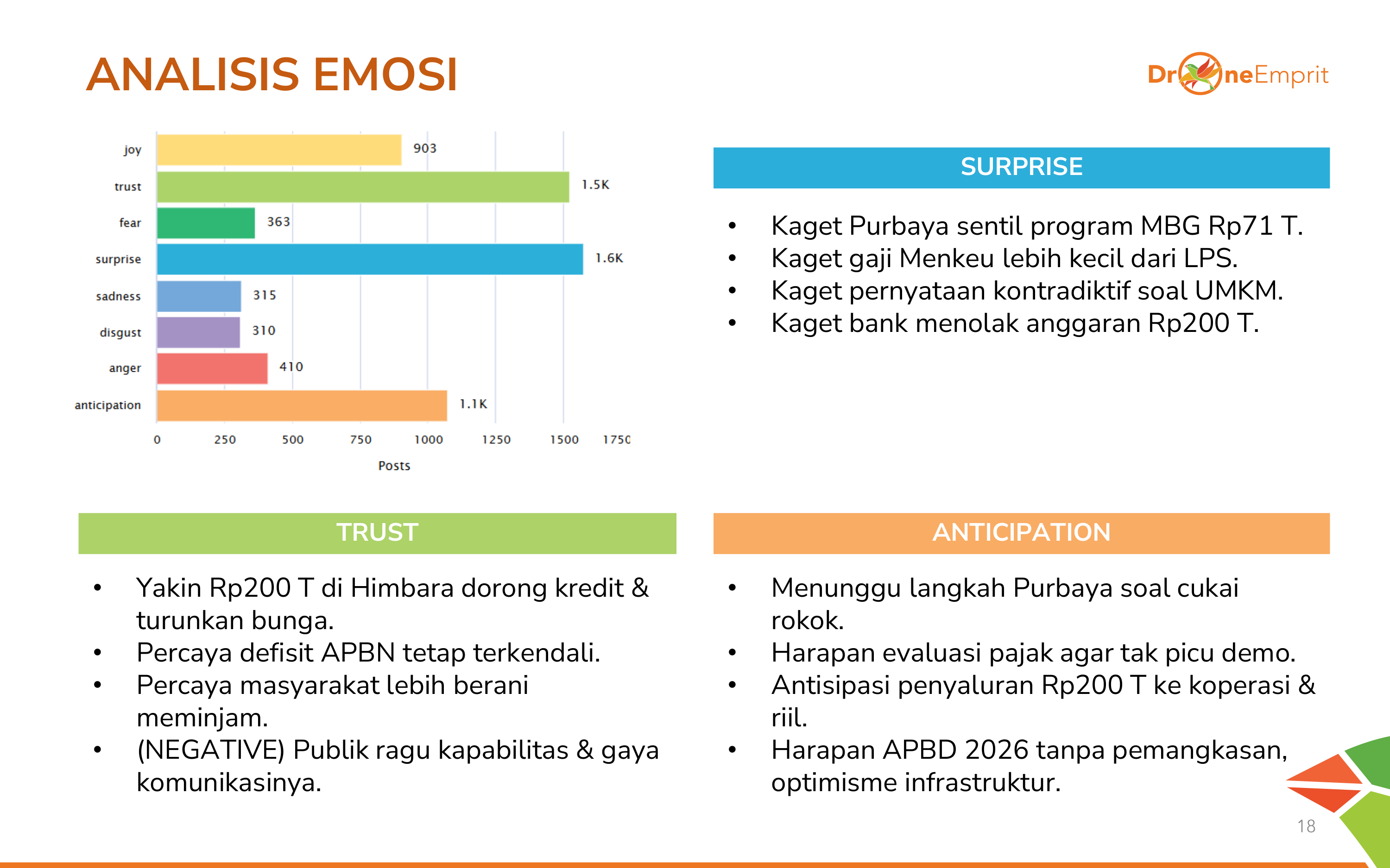 Tiga emosi utama terdeteksi: 'Trust' (kepercayaan & keraguan), 'Surprise' (keterkejutan atas kebijakan), & 'Anticipation' (harapan ekonomi).