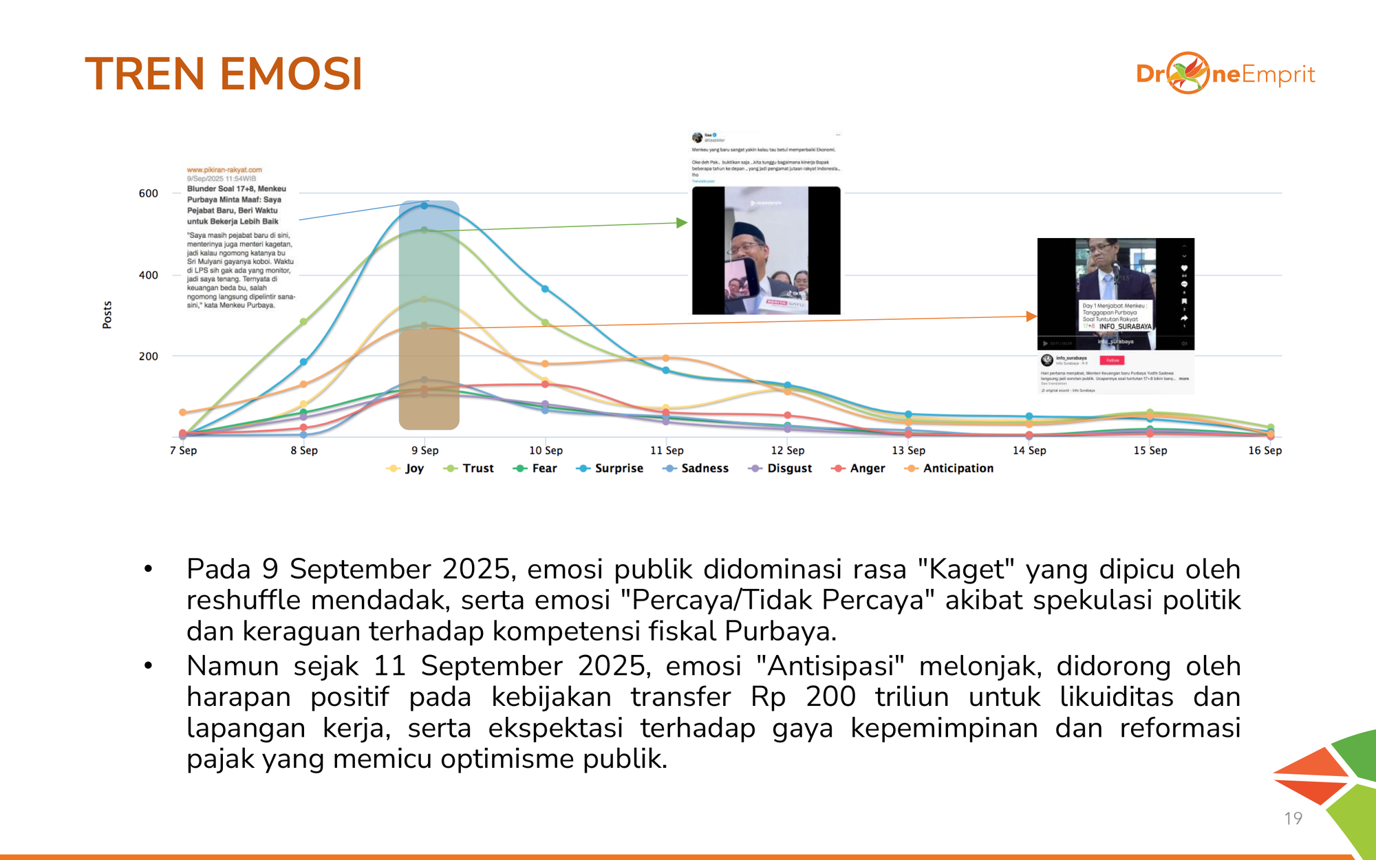 Pada 9 September, emosi publik didominasi "Kaget" & "Tidak Percaya" karena reshuffle mendadak. Namun sejak 11 September, emosi "Antisipasi" melonjak karena harapan positif.