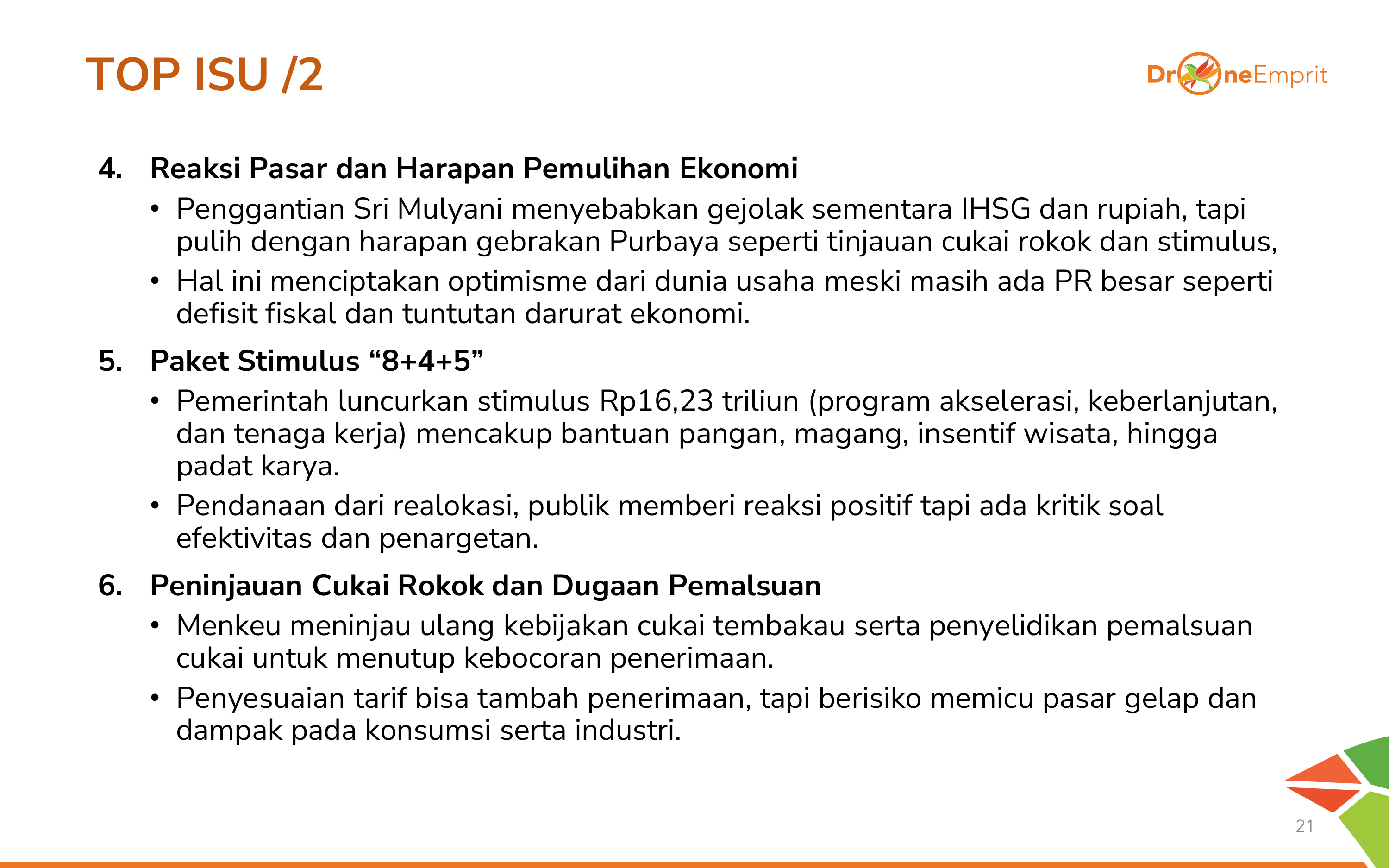 Isu populer lainnya mencakup reaksi pasar terhadap Menkeu baru, peluncuran paket stimulus "8+4+5", serta rencana peninjauan cukai rokok.