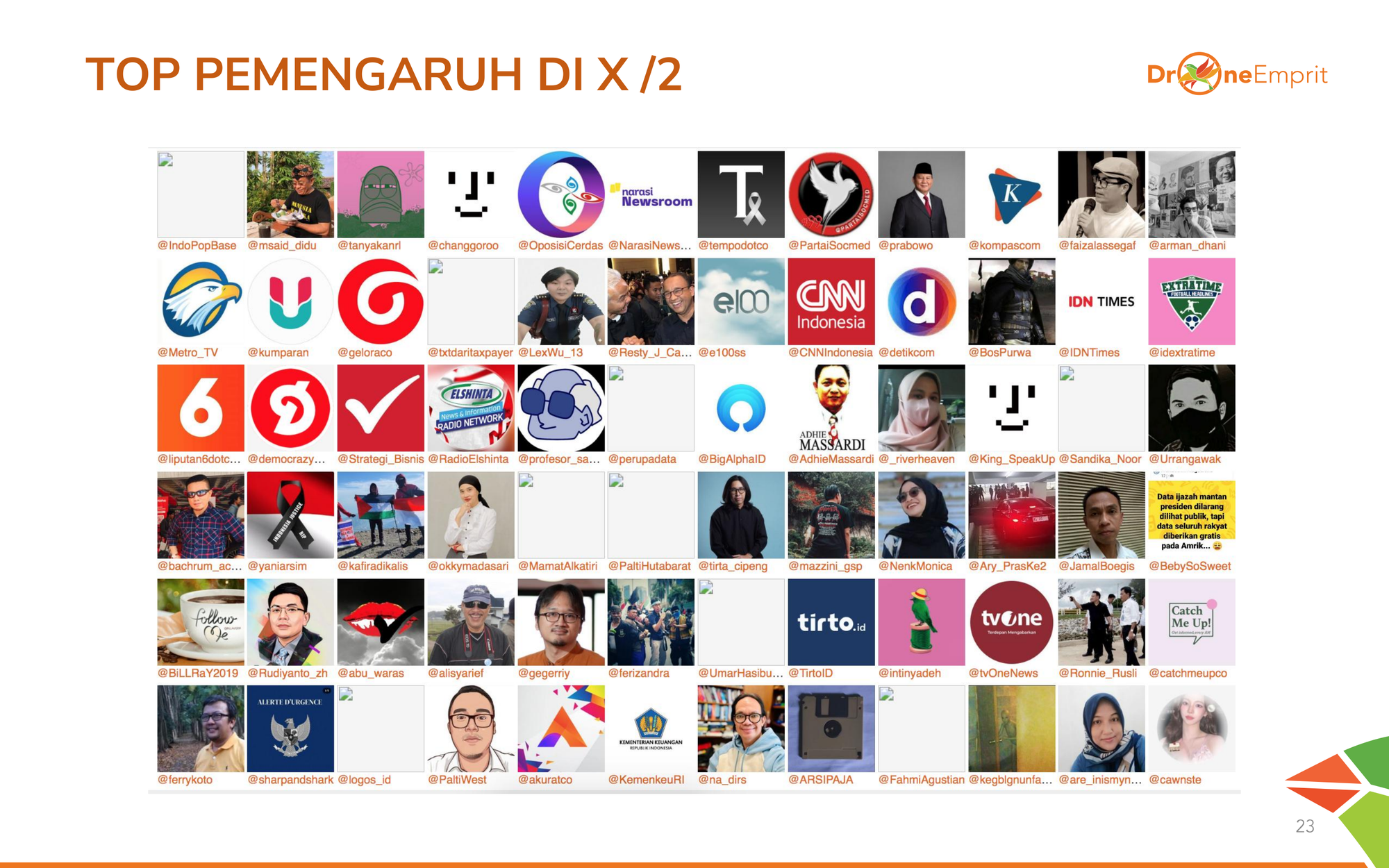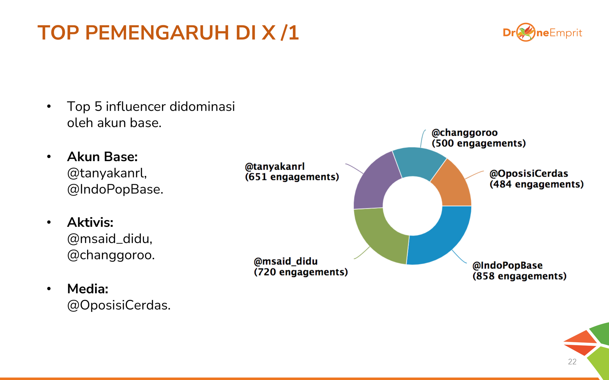 Di X, lima besar pemengaruh didominasi oleh akun base yang menjadi corong suara publik, diikuti oleh aktivis kritis serta akun media.