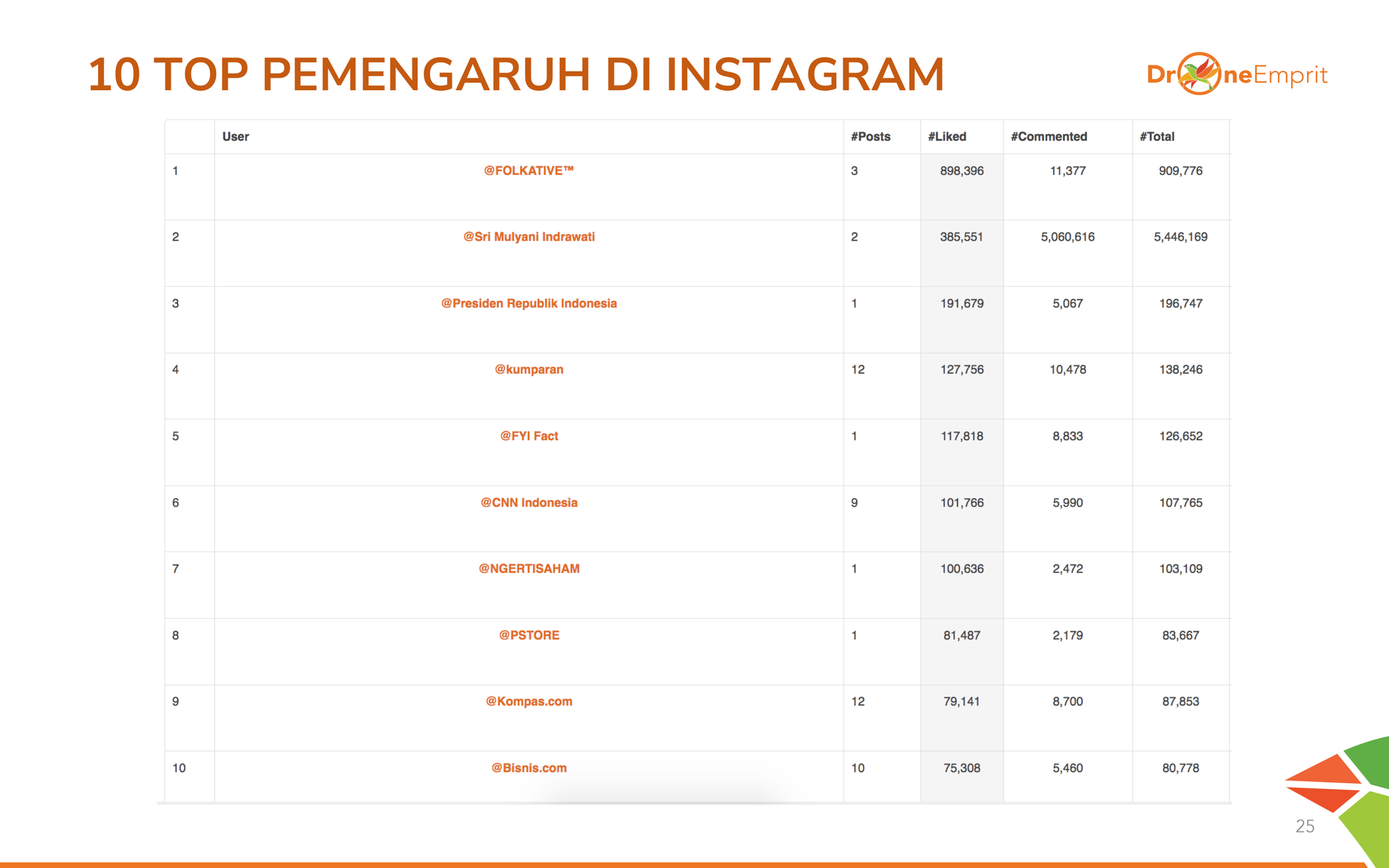 Peta pemengaruh di Instagram lebih beragam, didominasi akun aggregator berita seperti @folkative, akun resmi, serta media arus utama.