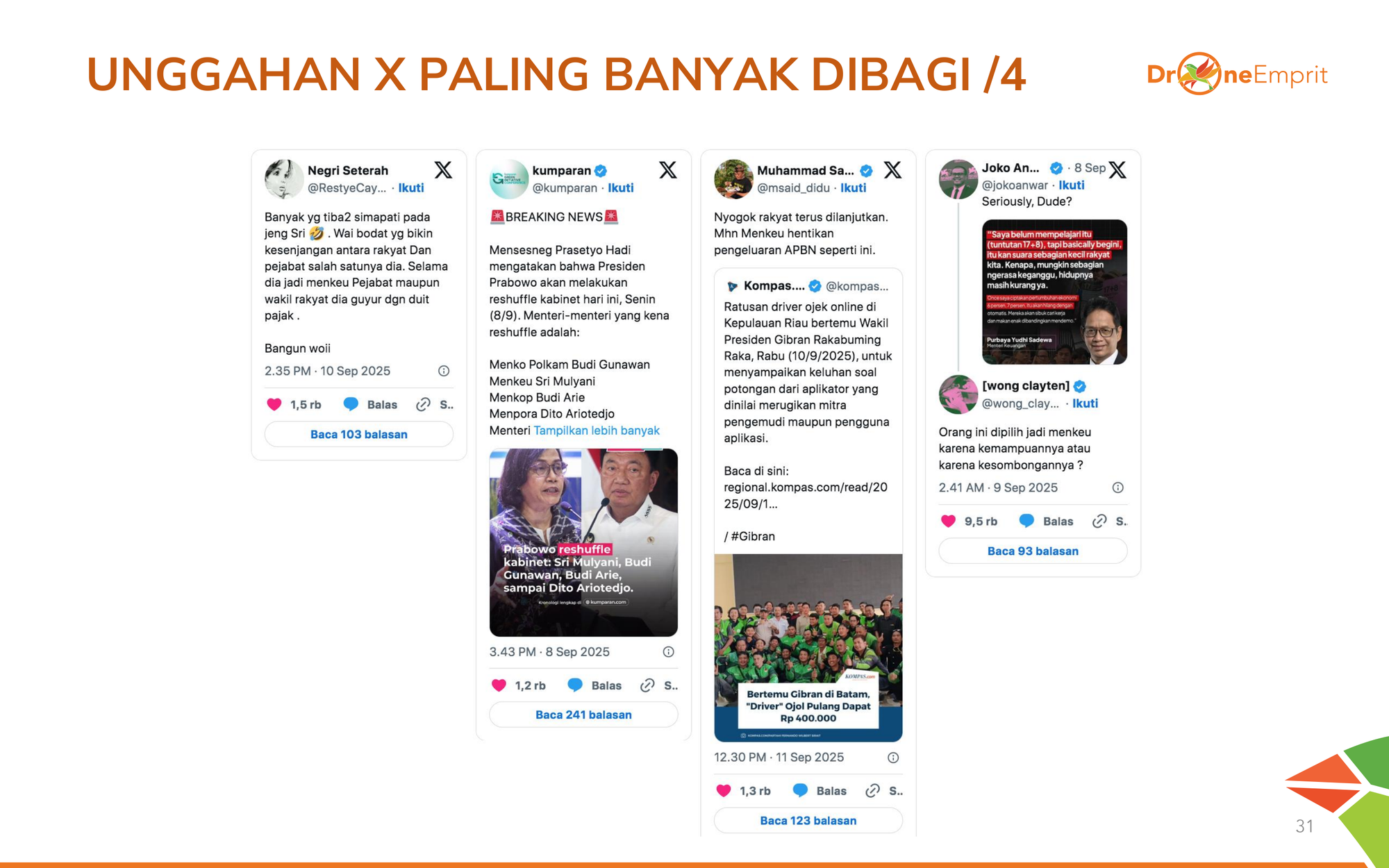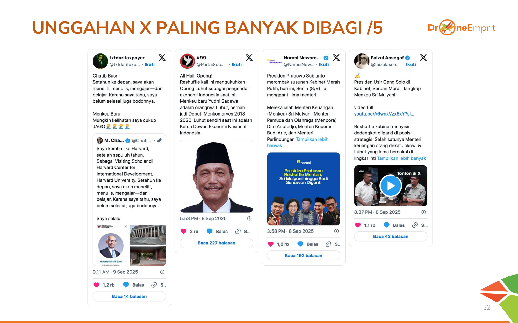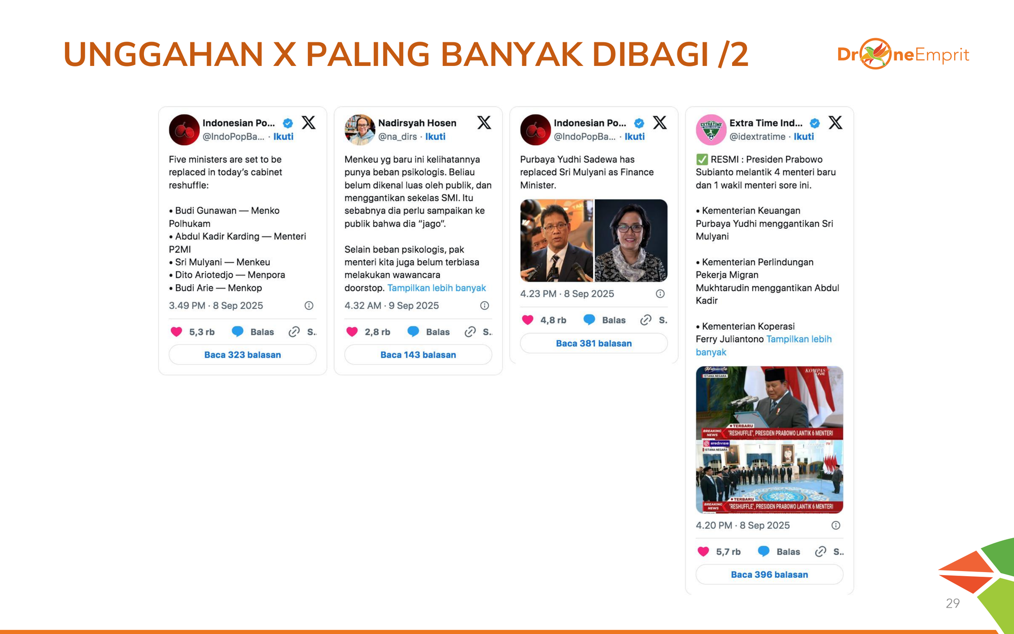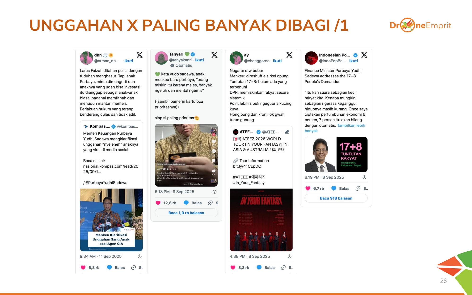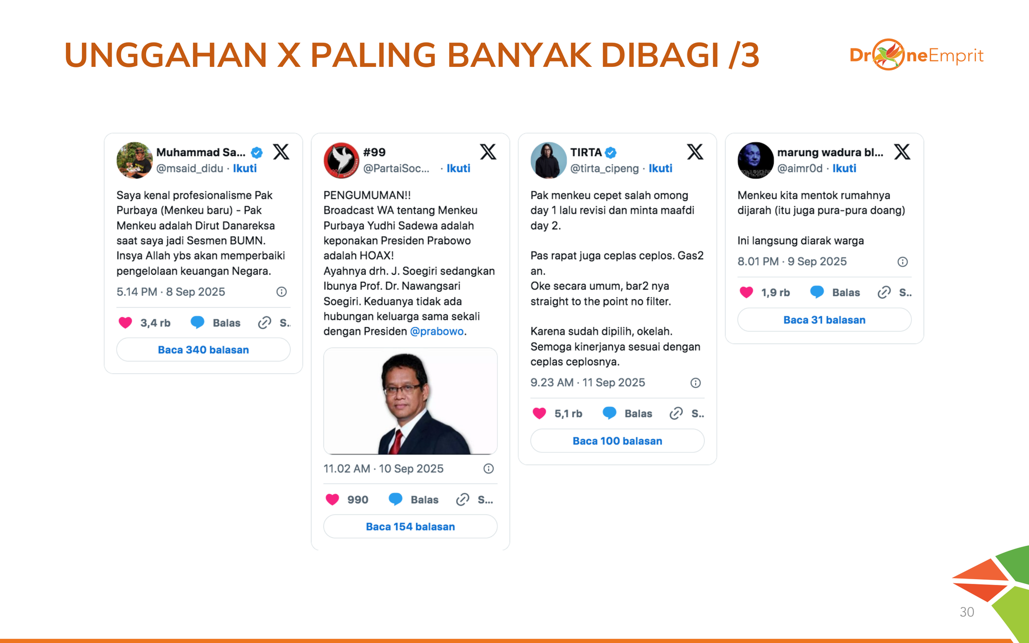 Unggahan X paling banyak dibagikan didominasi oleh kontroversi ucapan anak Menkeu baru, kritik terhadap pemerintah, & pernyataan Purbaya soal demo.