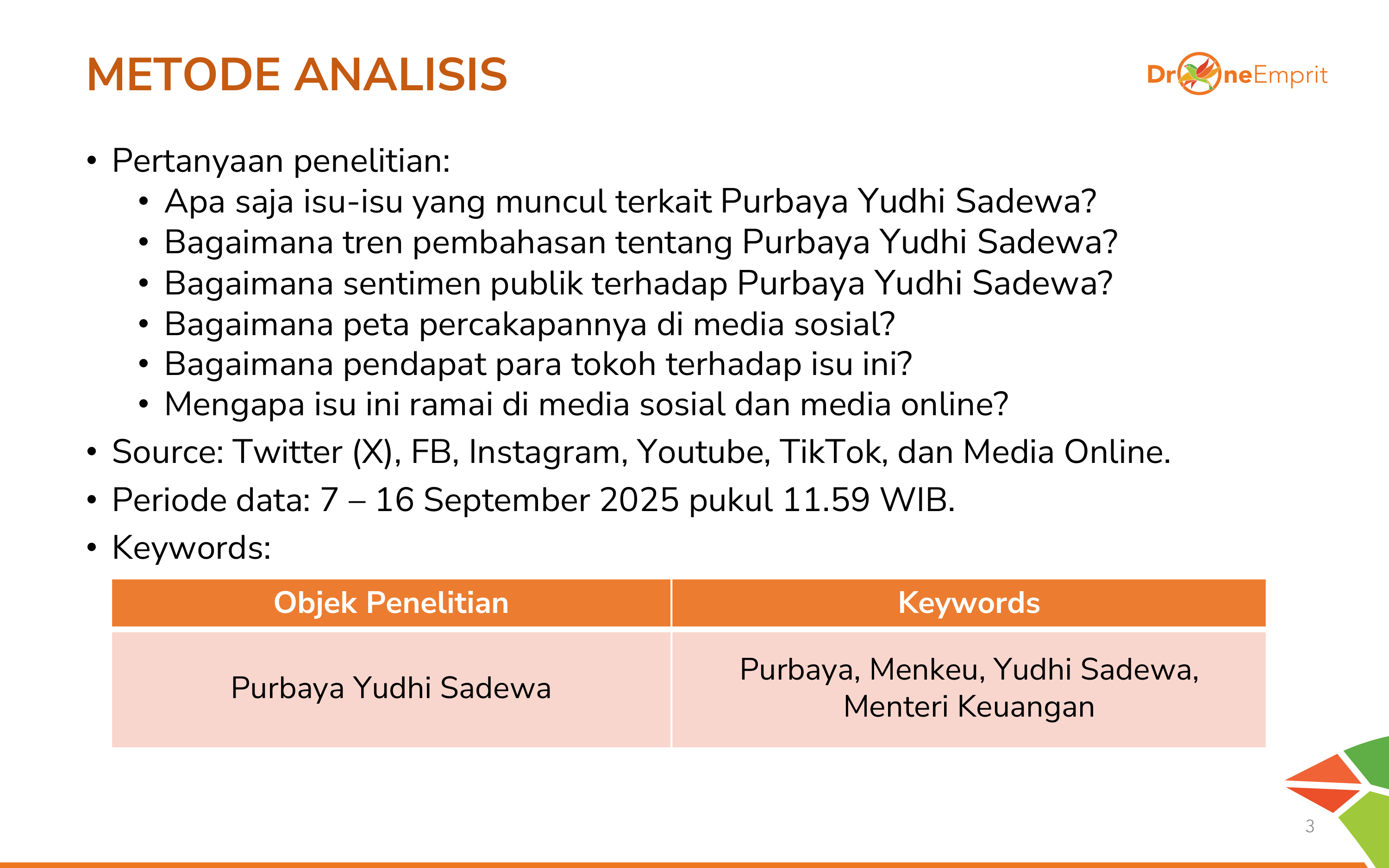 Analisis ini membedah isu & sentimen dari 6 platform (X, FB, IG, YT, TikTok, Media Online) periode 7-16 Sep 2025, menggunakan kata kunci spesifik.