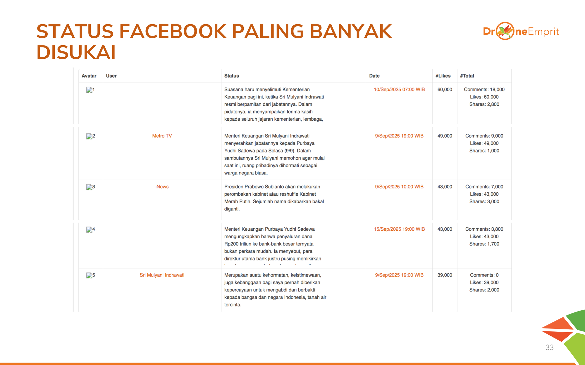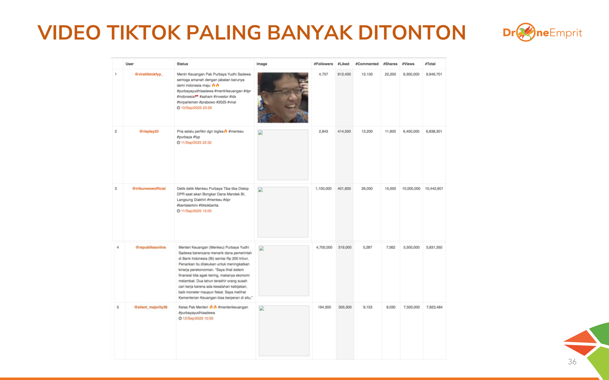 Berikut adalah daftar lengkap para pemengaruh teratas di platform X berdasarkan tingkat interaksi selama periode pemantauan isu Menkeu baru.