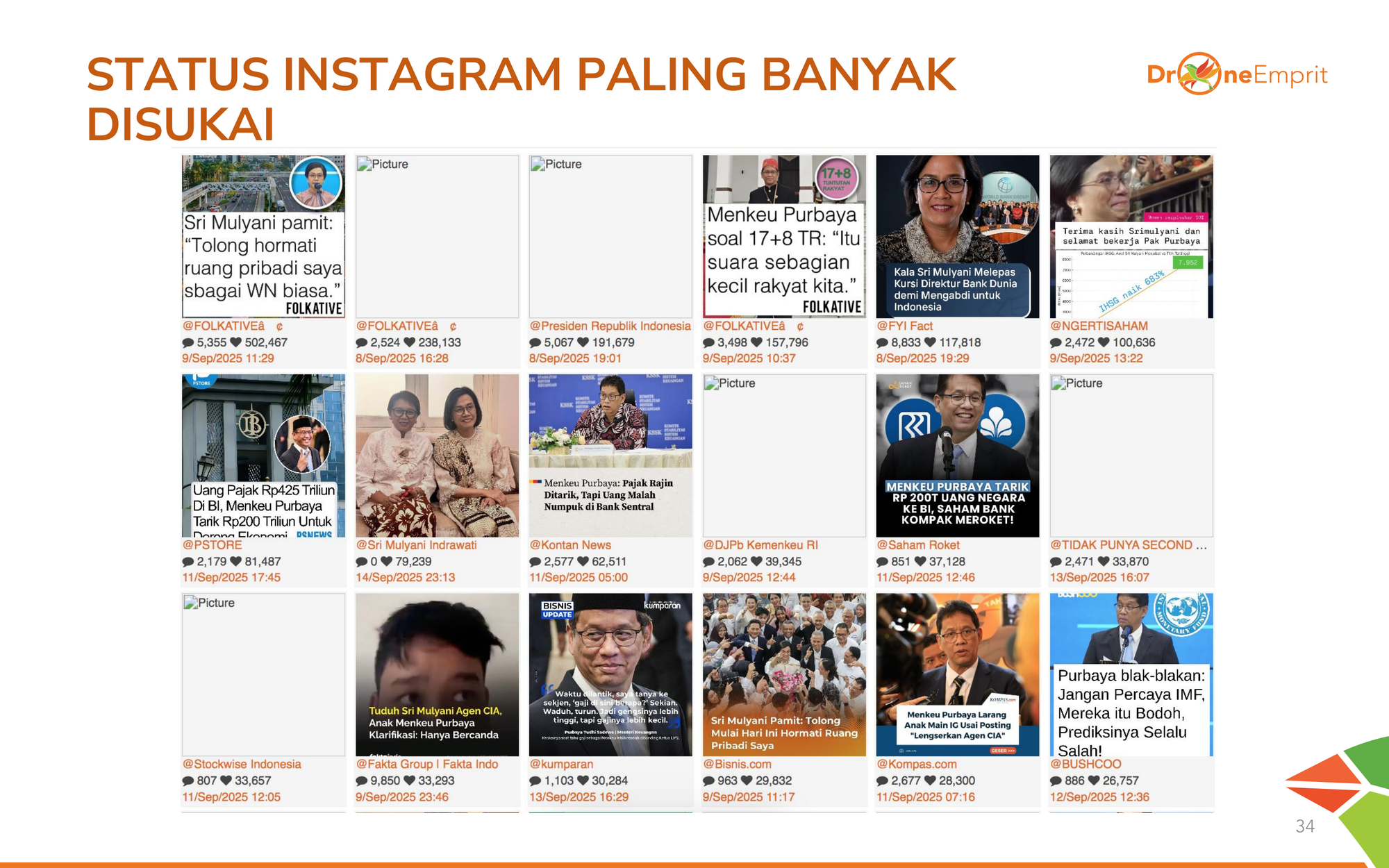Konten terpopuler Instagram didominasi oleh unggahan momen perpisahan Sri Mulyani dari akun aggregator, disusul pengumuman resmi dari akun Presiden.