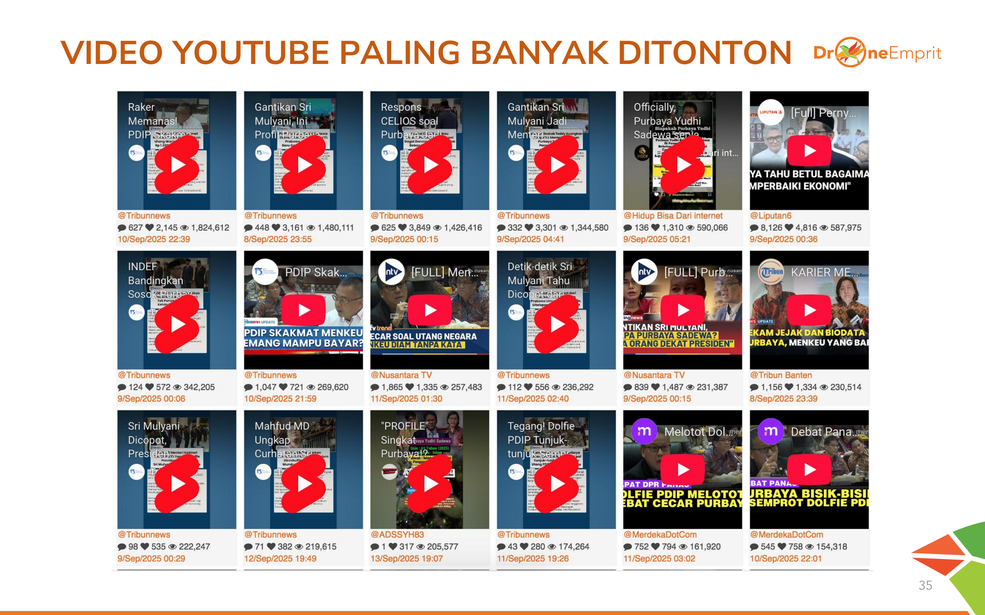Video YouTube paling ditonton didominasi oleh momen rapat kerja panas antara Menkeu Purbaya dengan anggota DPR dari PDIP, serta video profil Menkeu baru.