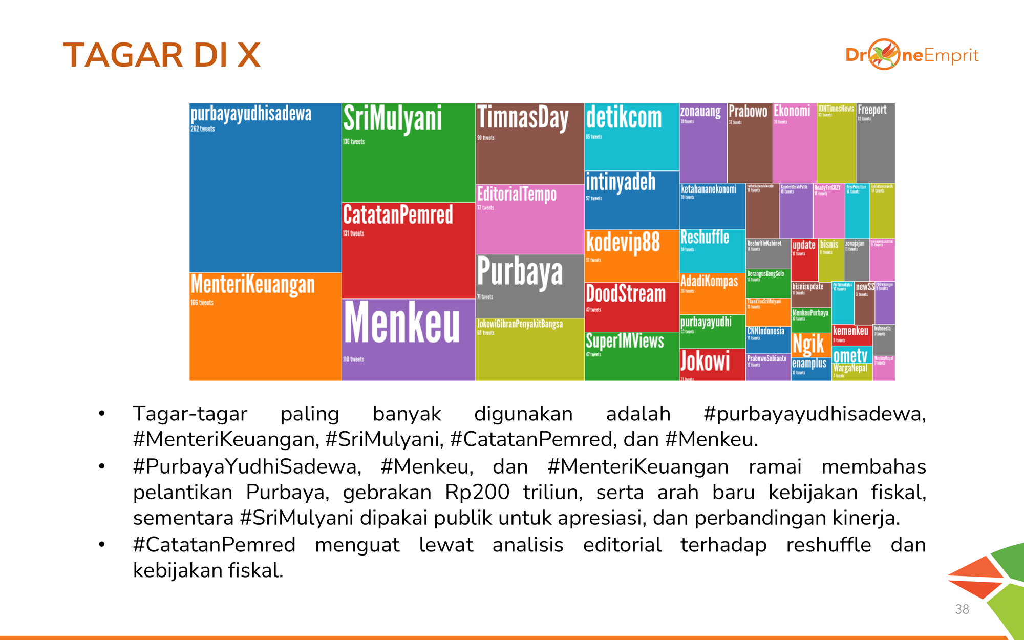 Tagar populer berfokus pada figur kunci seperti #PurbayaYudhiSadewa & #SriMulyani, serta tagar informatif seperti #MenteriKeuangan dan #Menkeu.