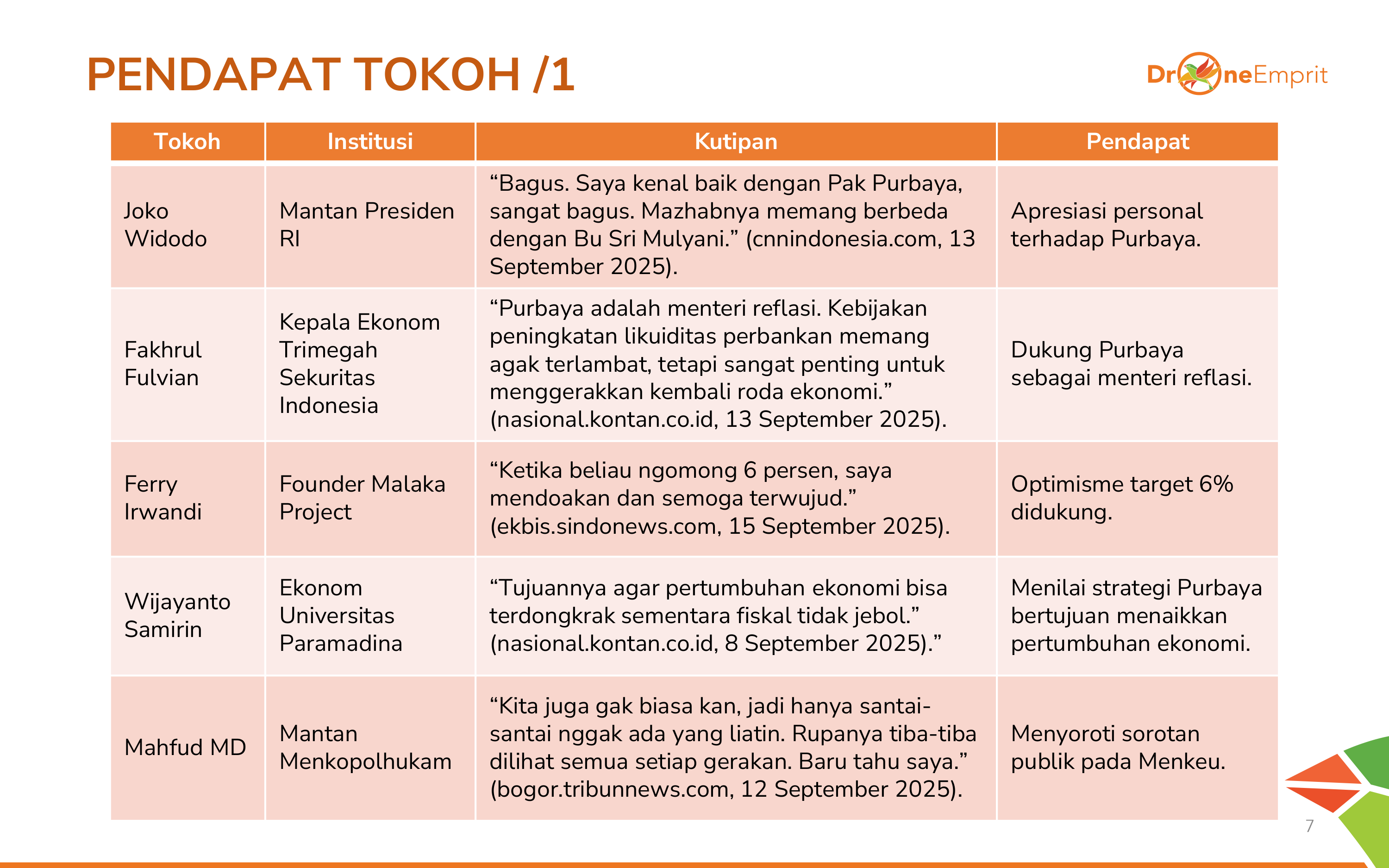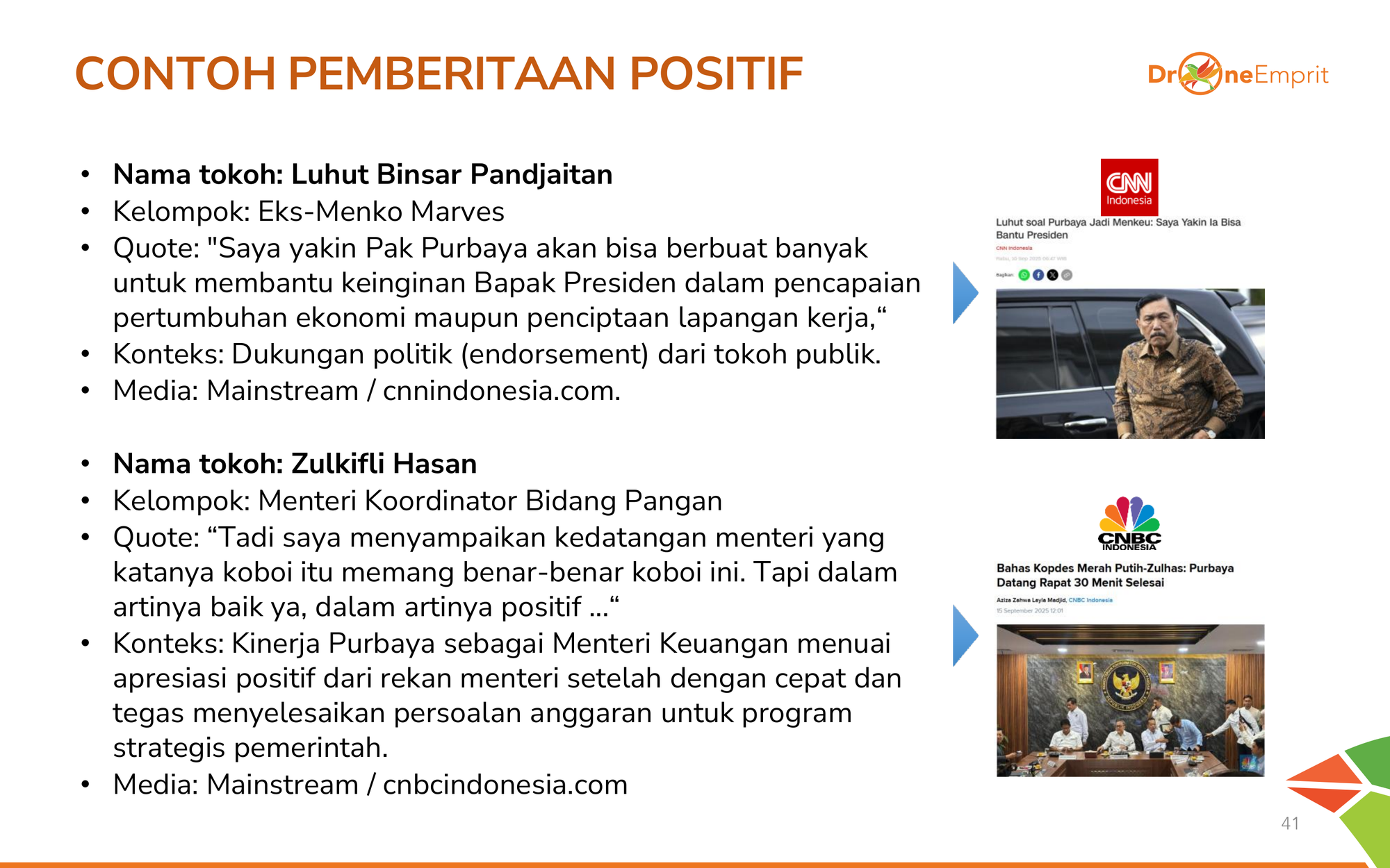Pemberitaan positif datang dari kutipan tokoh seperti Luhut Binsar Pandjaitan & Zulkifli Hasan, yang mendukung & mengapresiasi gaya 'koboi' Purbaya.