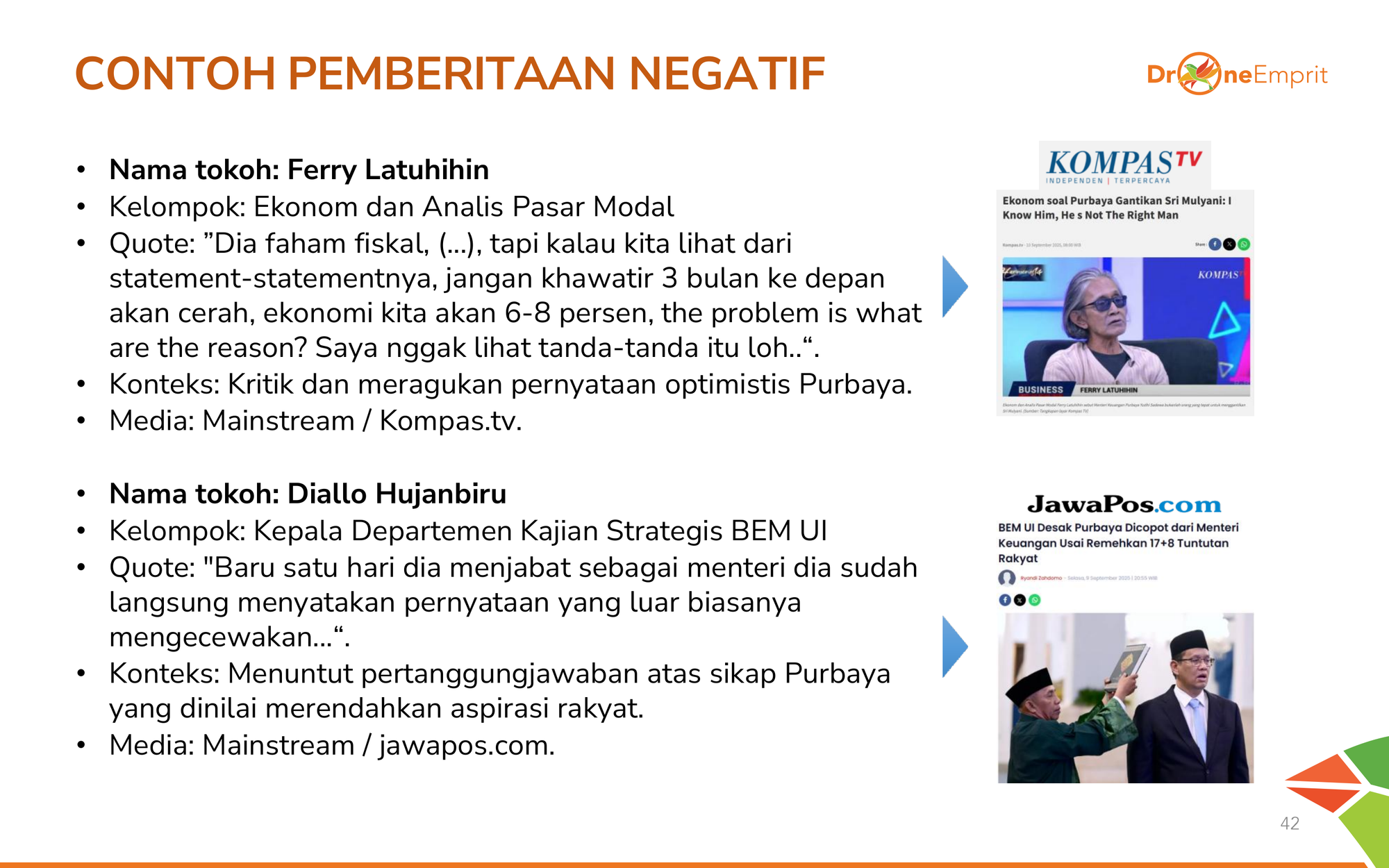 Pemberitaan negatif diwakili oleh suara pengamat & mahasiswa. Ferry Latuhihin meragukan optimisme Purbaya, sementara BEM UI mengecam pernyataannya.