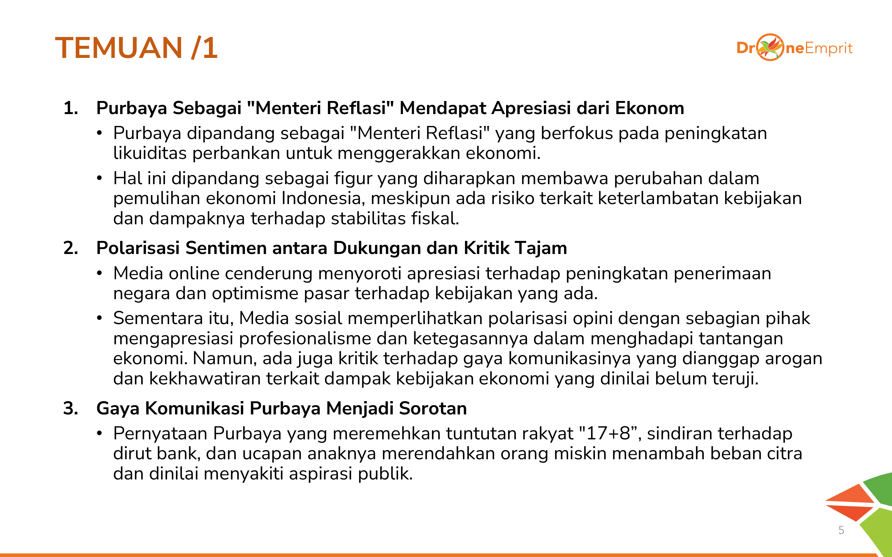 Tiga temuan utama: Purbaya sebagai "Menteri Reflasi", polarisasi sentimen antara media online & medsos, serta gaya komunikasinya yang jadi sorotan tajam.