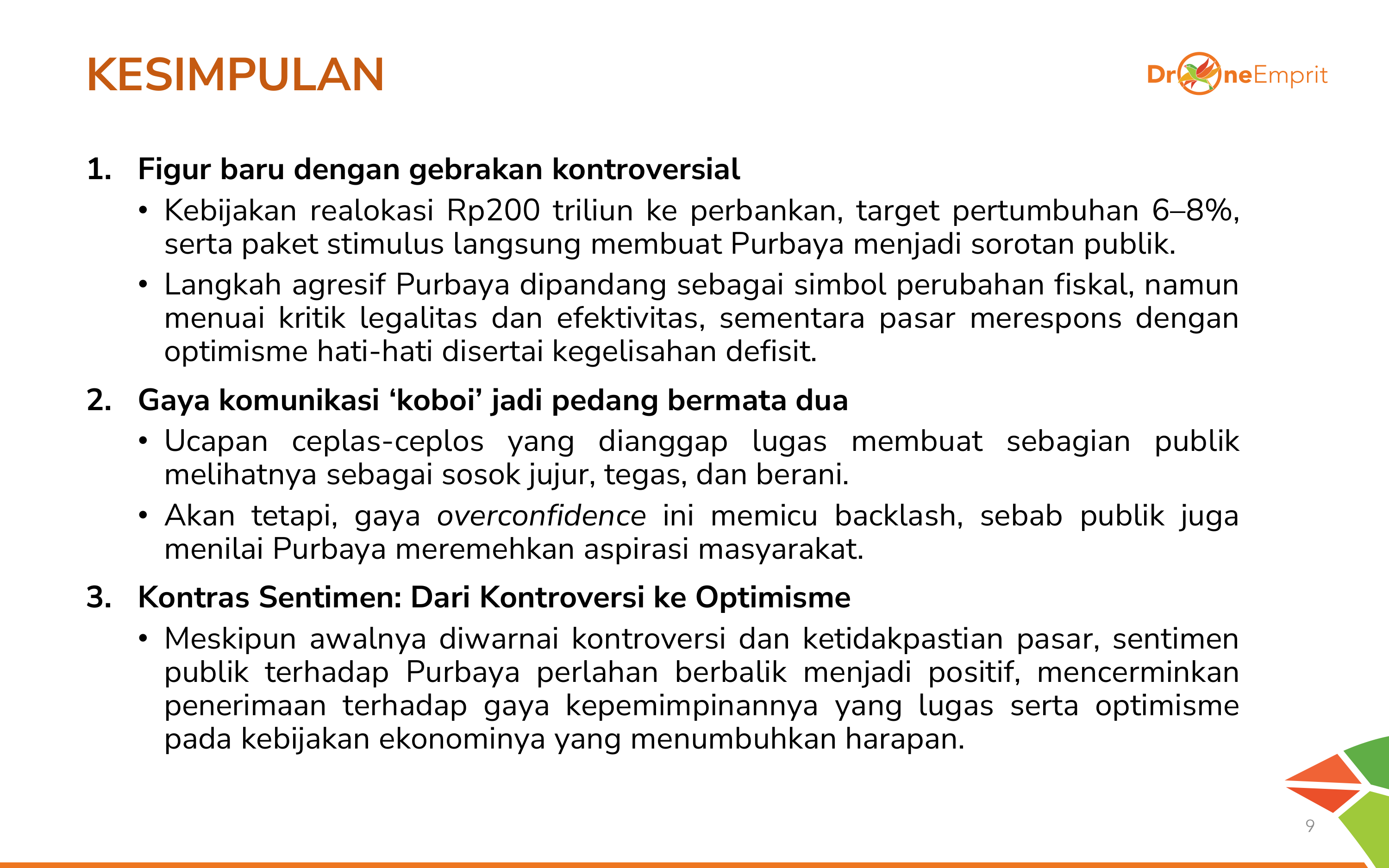 Kesimpulan: Purbaya adalah figur kontroversial dengan gebrakan berani & gaya 'koboi'. Awalnya menuai kritik, sentimen publik perlahan berbalik positif. Siapa & topik apa yang paling mendominasi percakapan?