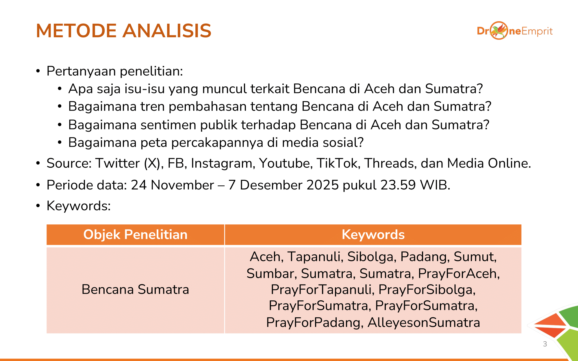 Kami memantau 7 platform medsos & media online (24 Nov-7 Des). Fokus analisis mencakup tren isu, sentimen, hingga peta percakapan dengan keywords seperti #PrayForSumatra, #PrayForAceh hingga #AlleyesonSumatra.