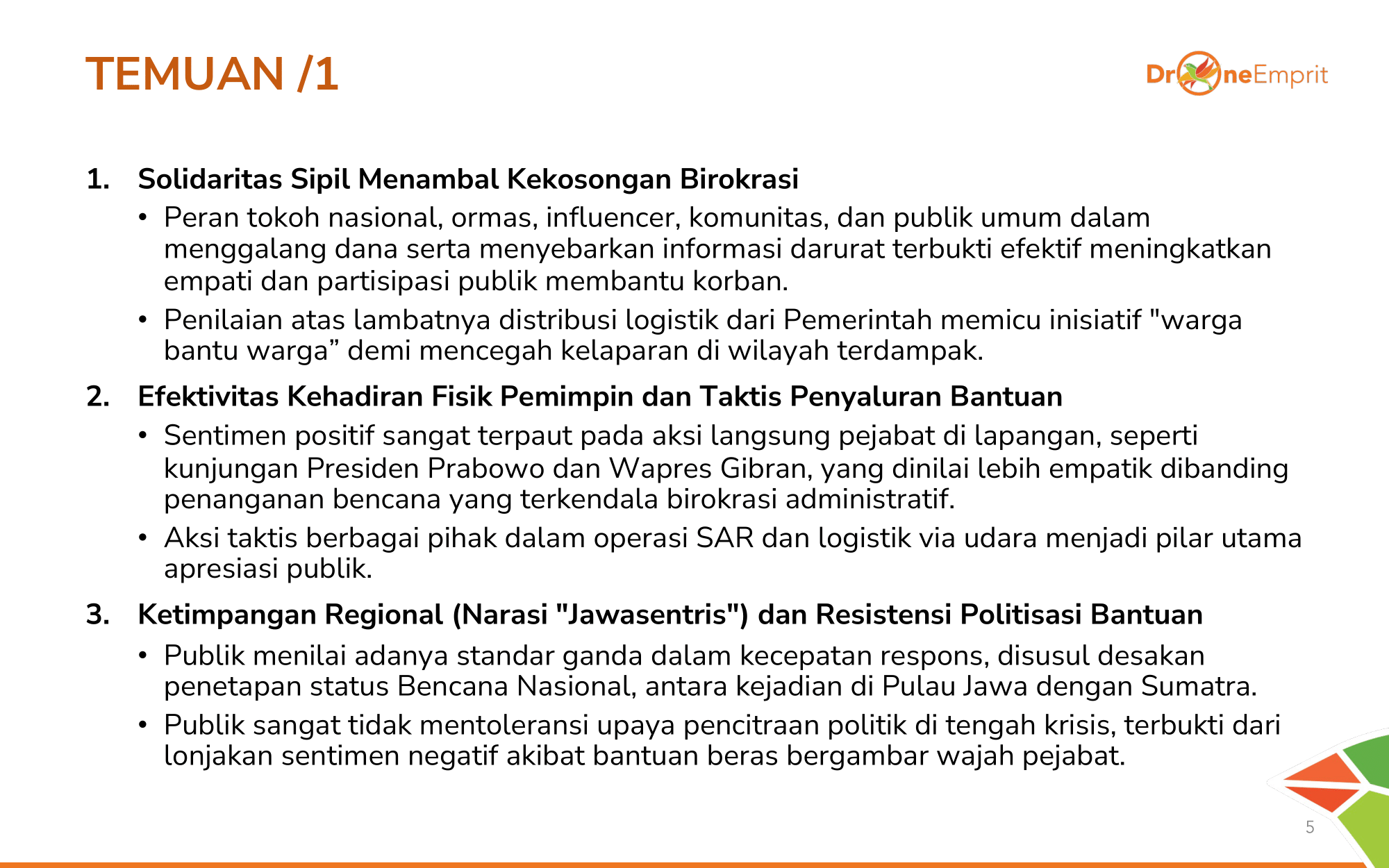 Sentimen positif didorong aksi tegas pemimpin. Komitmen Presiden Prabowo menambah anggaran daerah & gerak cepat Kapolri mengerahkan pasukan, dinilai sebagai langkah konkret "memanusiakan" korban bencana di luar Jawa.