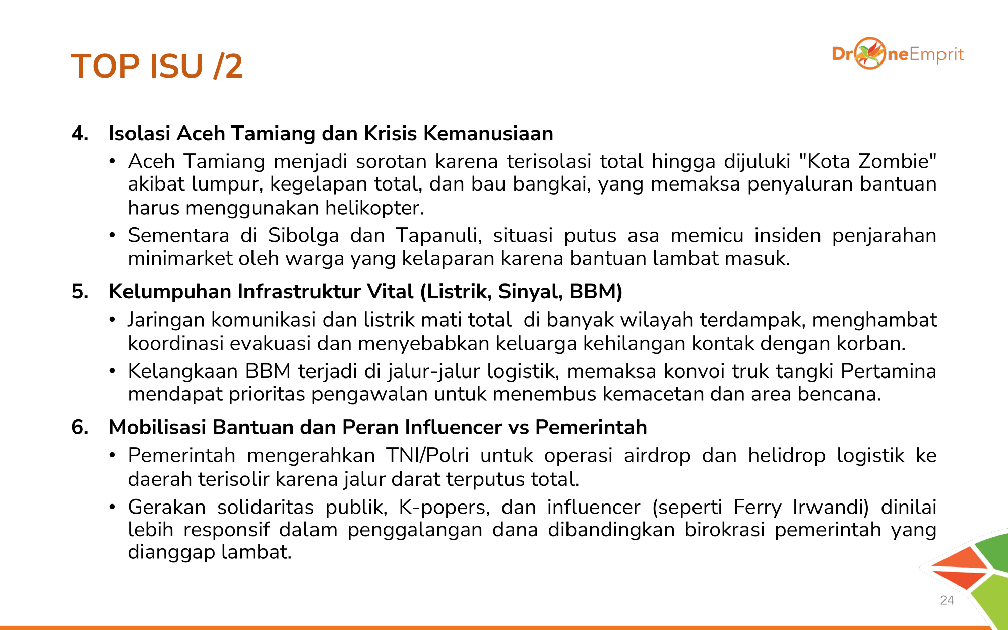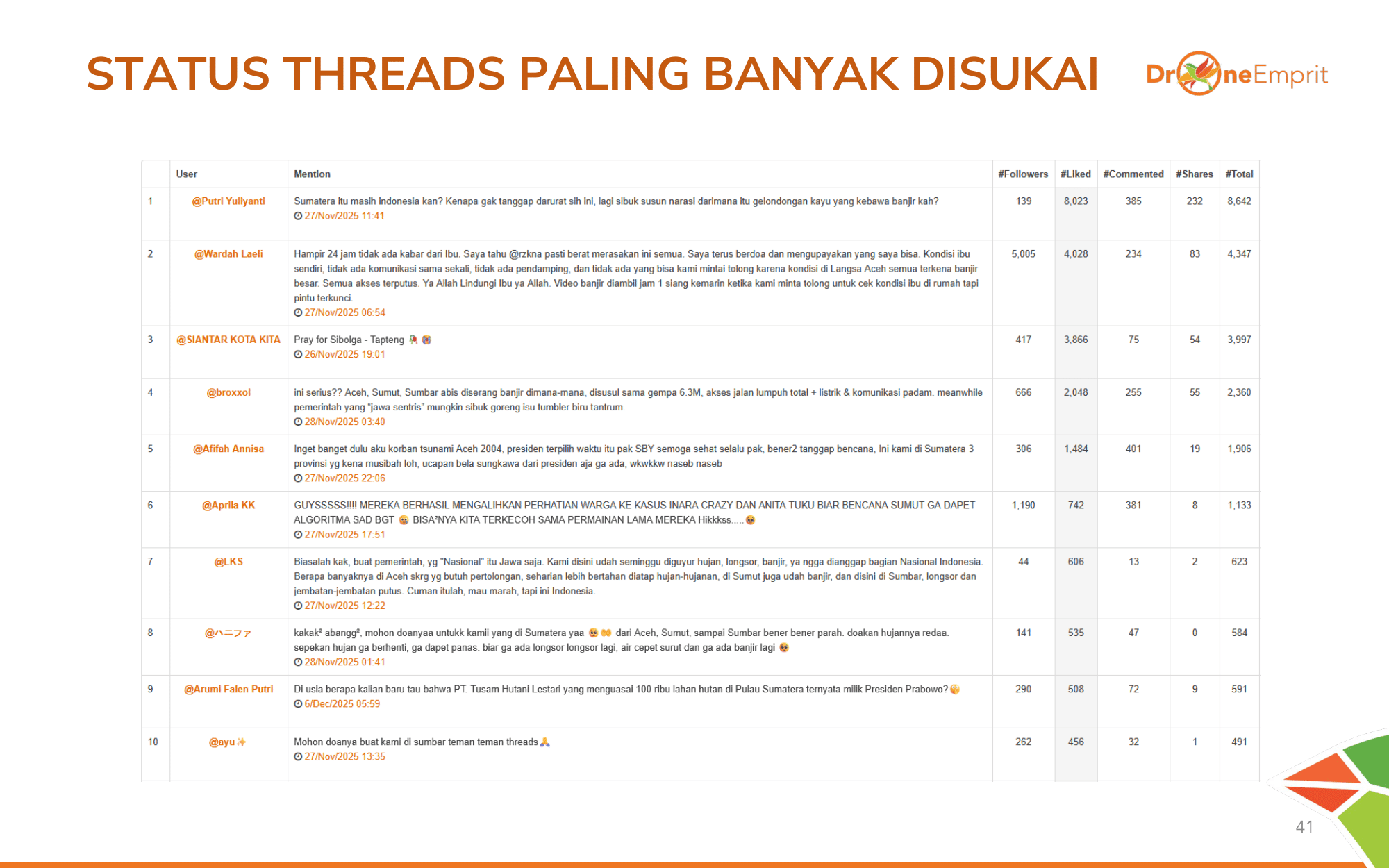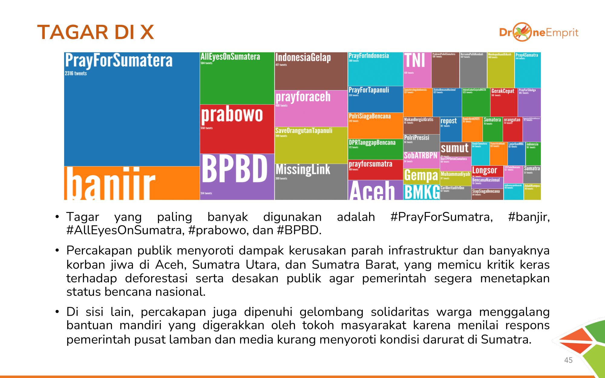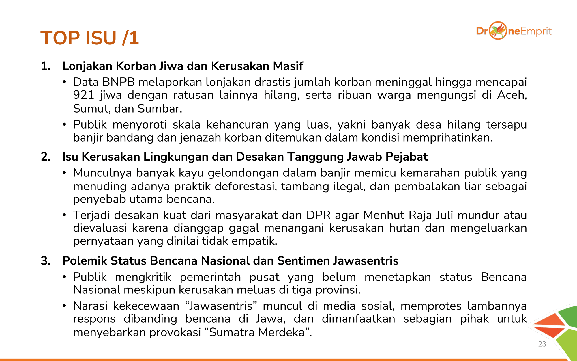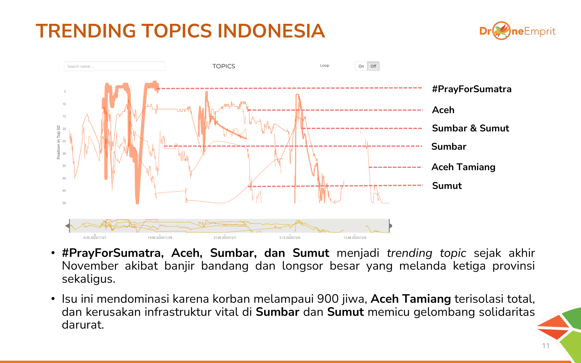 Isu ini memicu 304.056 mentions dengan interaksi raksasa mencapai 974 Juta! Angka ini menjadi bukti bahwa atensi publik sangat besar dan masif terhadap bencana yang menimpa saudara kita di Sumatra.