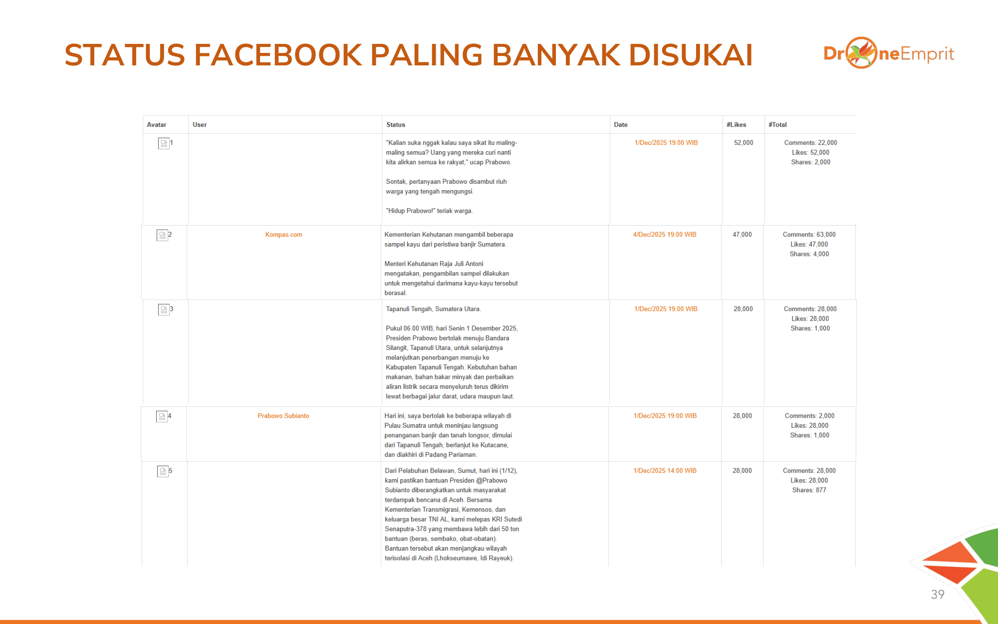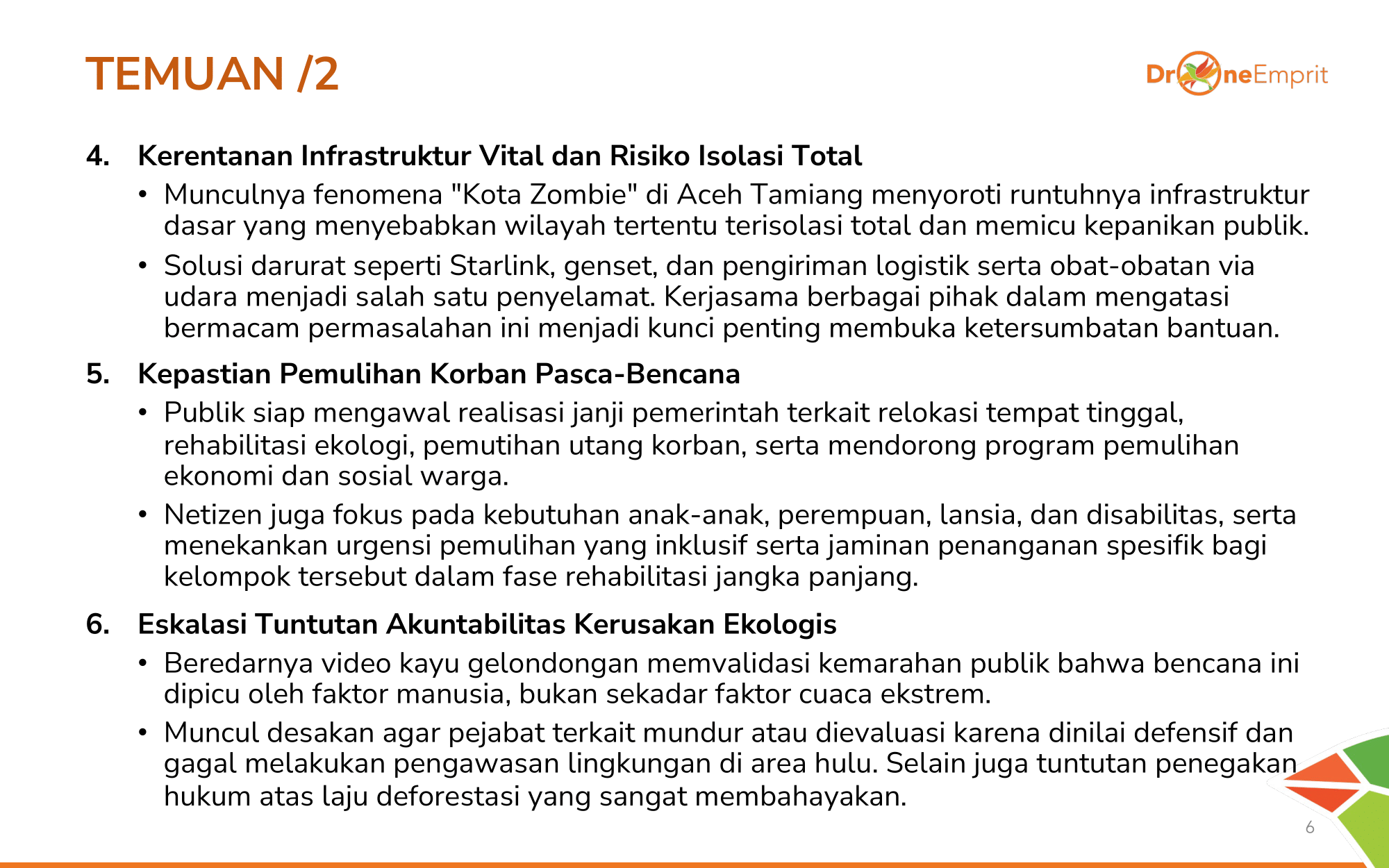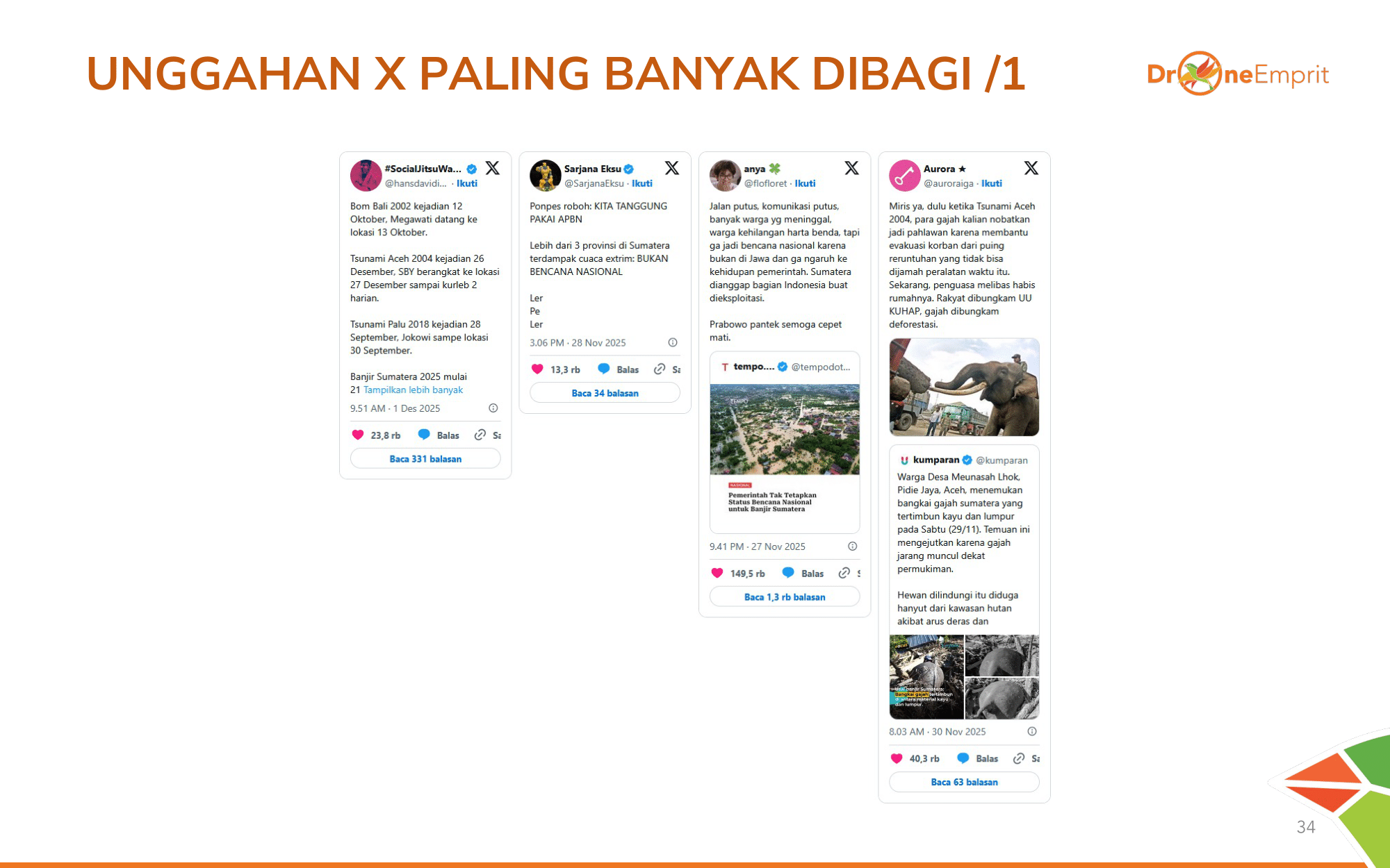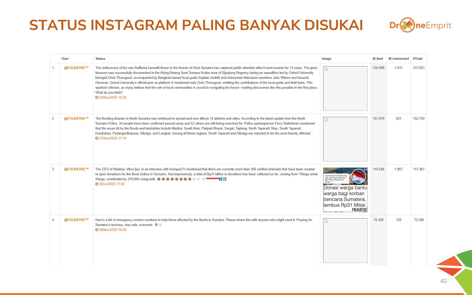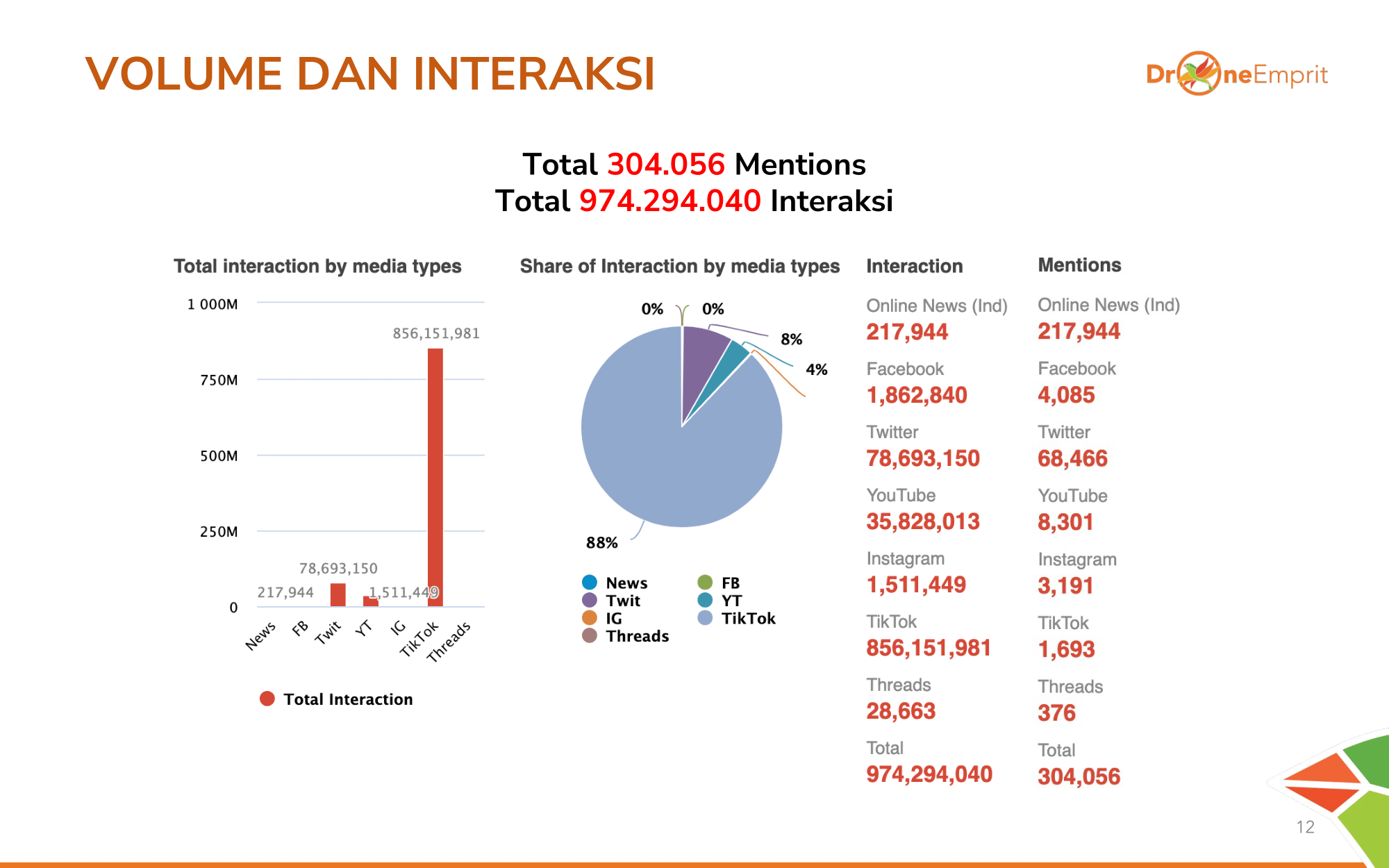 Isu ini memicu 304.056 mentions dengan interaksi raksasa mencapai 974 Juta! Angka ini menjadi bukti bahwa atensi publik sangat besar dan masif terhadap bencana yang menimpa saudara kita di Sumatra.