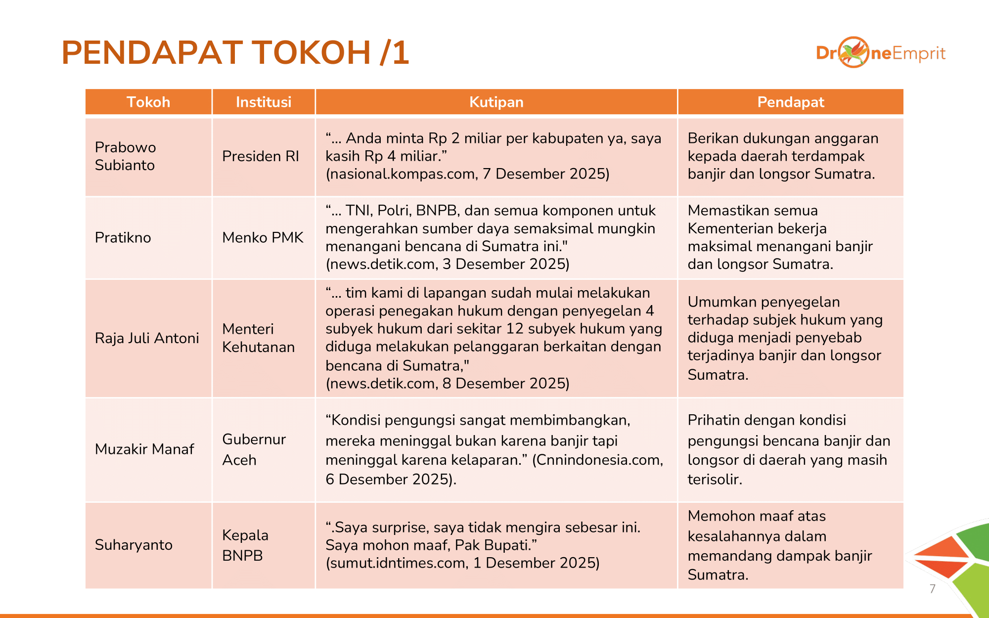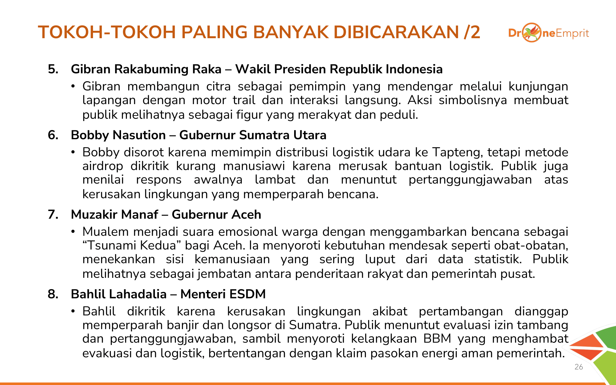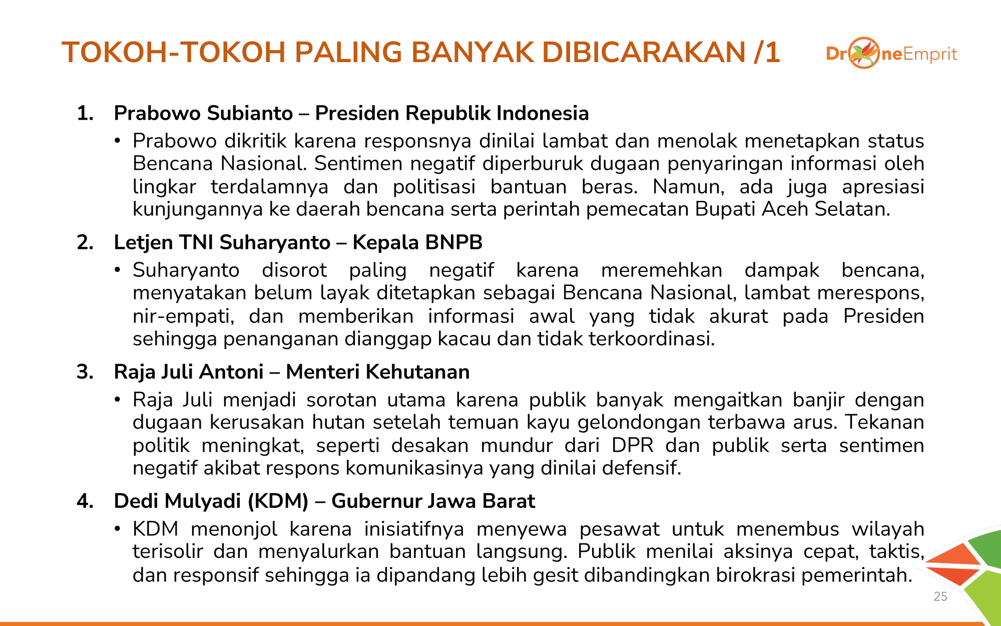 Prabowo tuai pro-kontra (lambat vs hadir). Kepala BNPB & Menhut panen sentimen negatif akibat pernyataan yang dinilai blunder & defensif. Dedi Mulyadi diapresiasi karena inisiatif sewa pesawat logistik.
