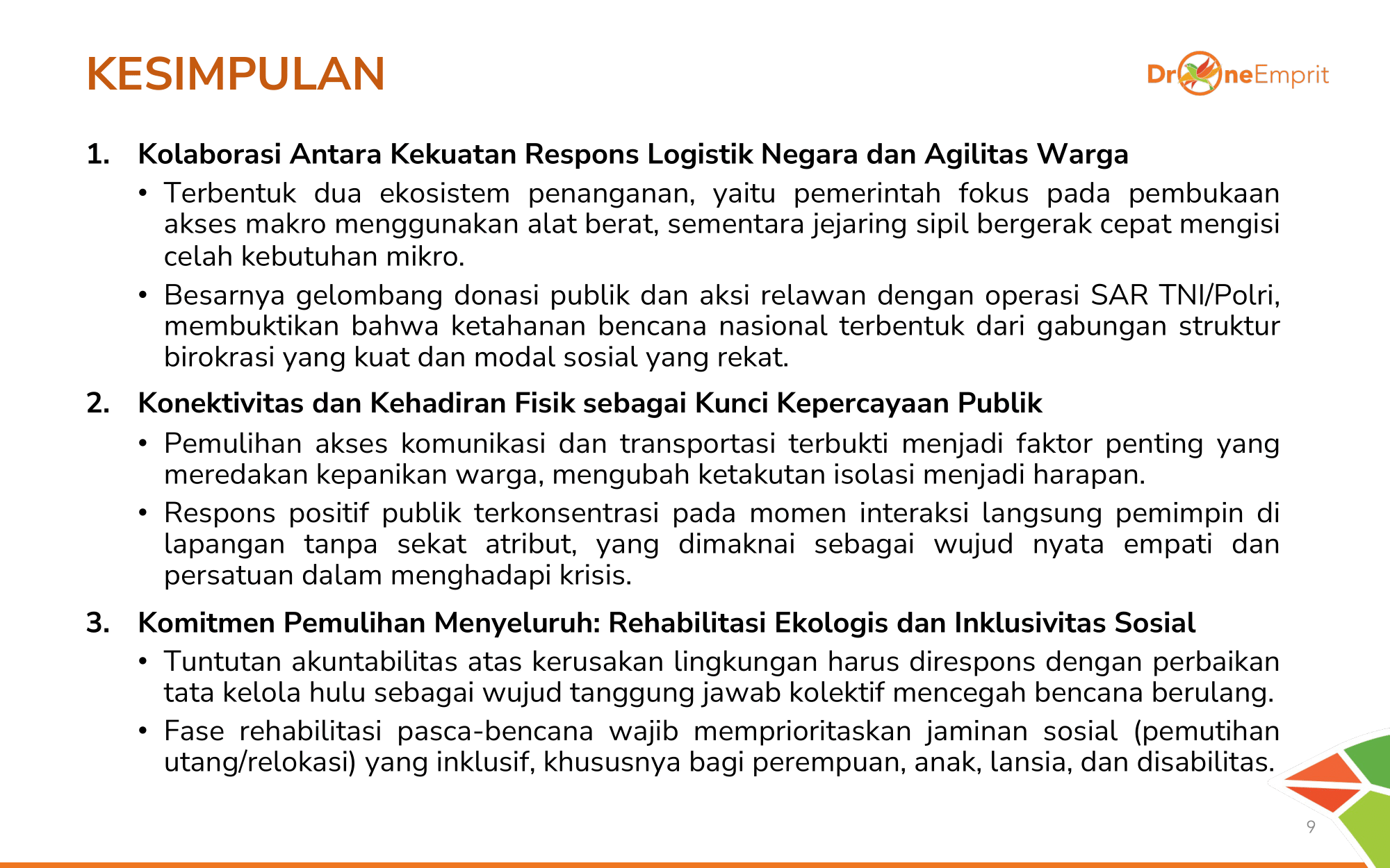 Solidaritas sipil sukses menambal celah birokrasi. Kehadiran fisik Presiden/Wapres di lapangan sedikit meredam emosi, namun publik menolak keras politisasi bantuan (beras bergambar wajah) di tengah isu ketimpangan regional.