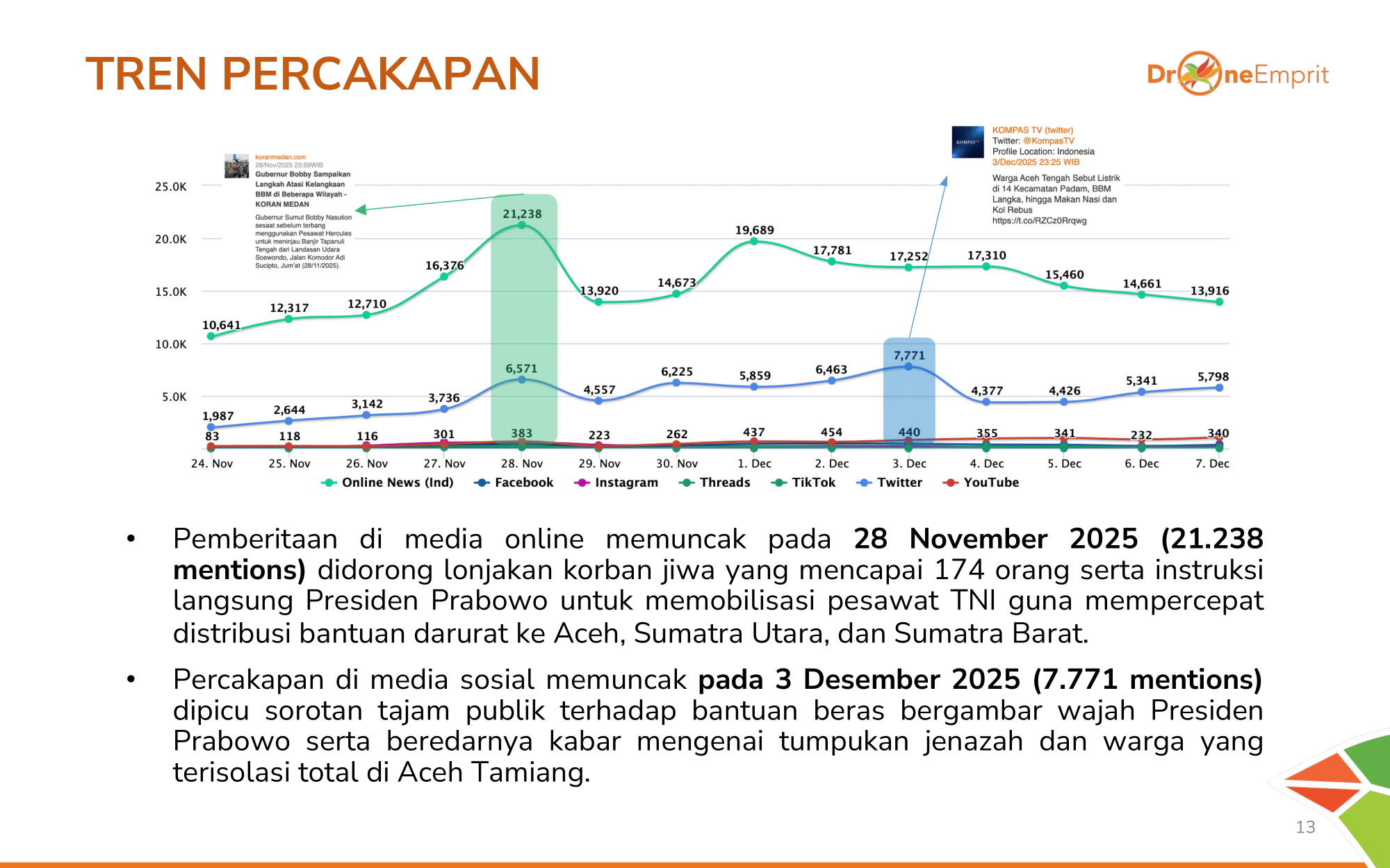 Berita online memuncak 28 Nov saat instruksi Presiden turun. Namun, percakapan Medsos justru meledak 3 Des, dipicu kemarahan atas isu politisasi bantuan beras & kabar pilu dari warga yang terisolasi total.