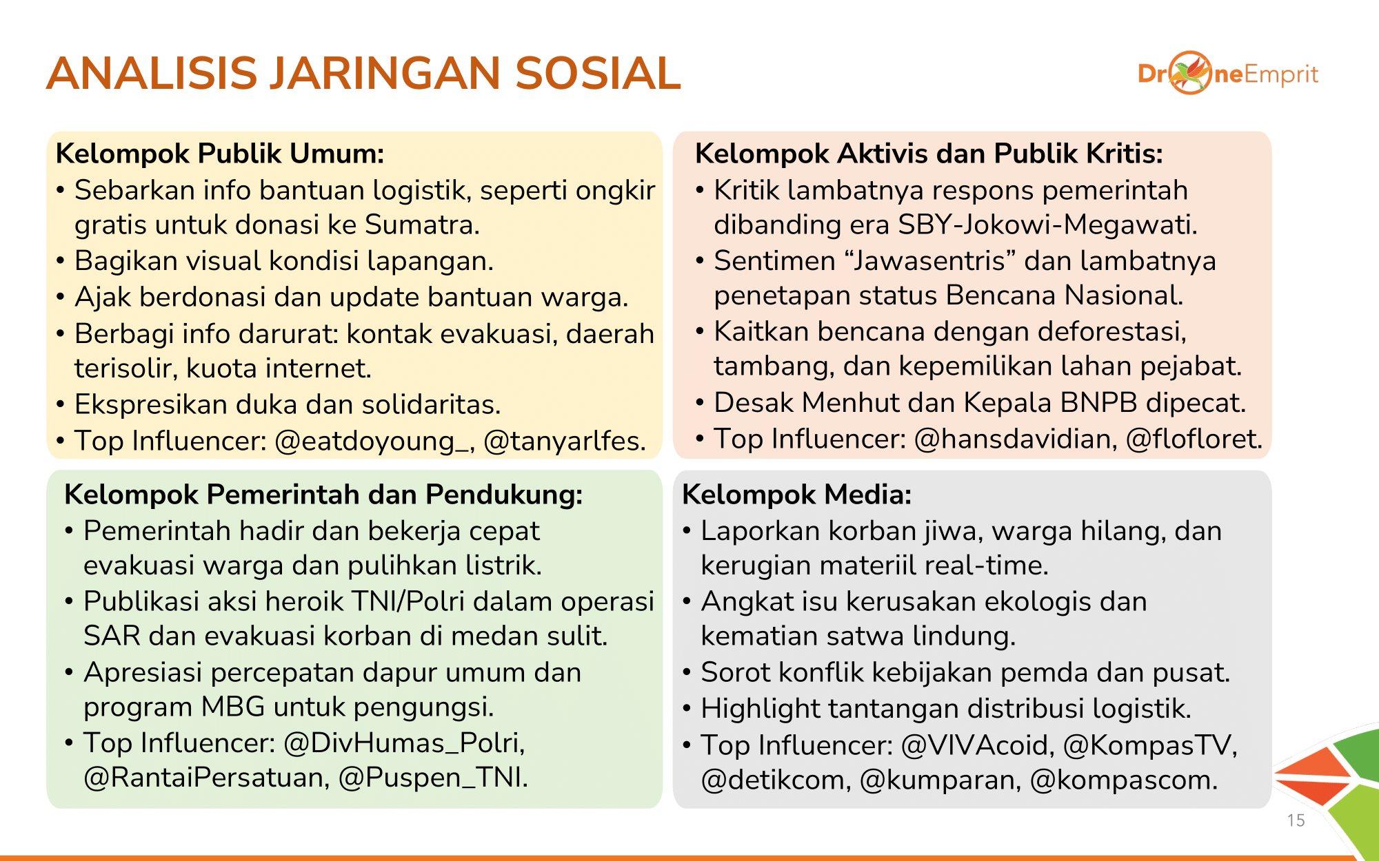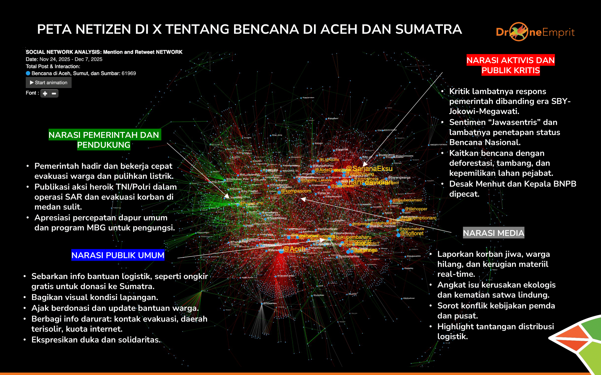 Netizen fokus galang bantuan logistik. Aktivis kritisi deforestasi & narasi "Jawasentris". Kubu Pemerintah narasikan keberhasilan evakuasi TNI/Polri, sementara Media fokus melaporkan update data korban & kendala lapangan.
