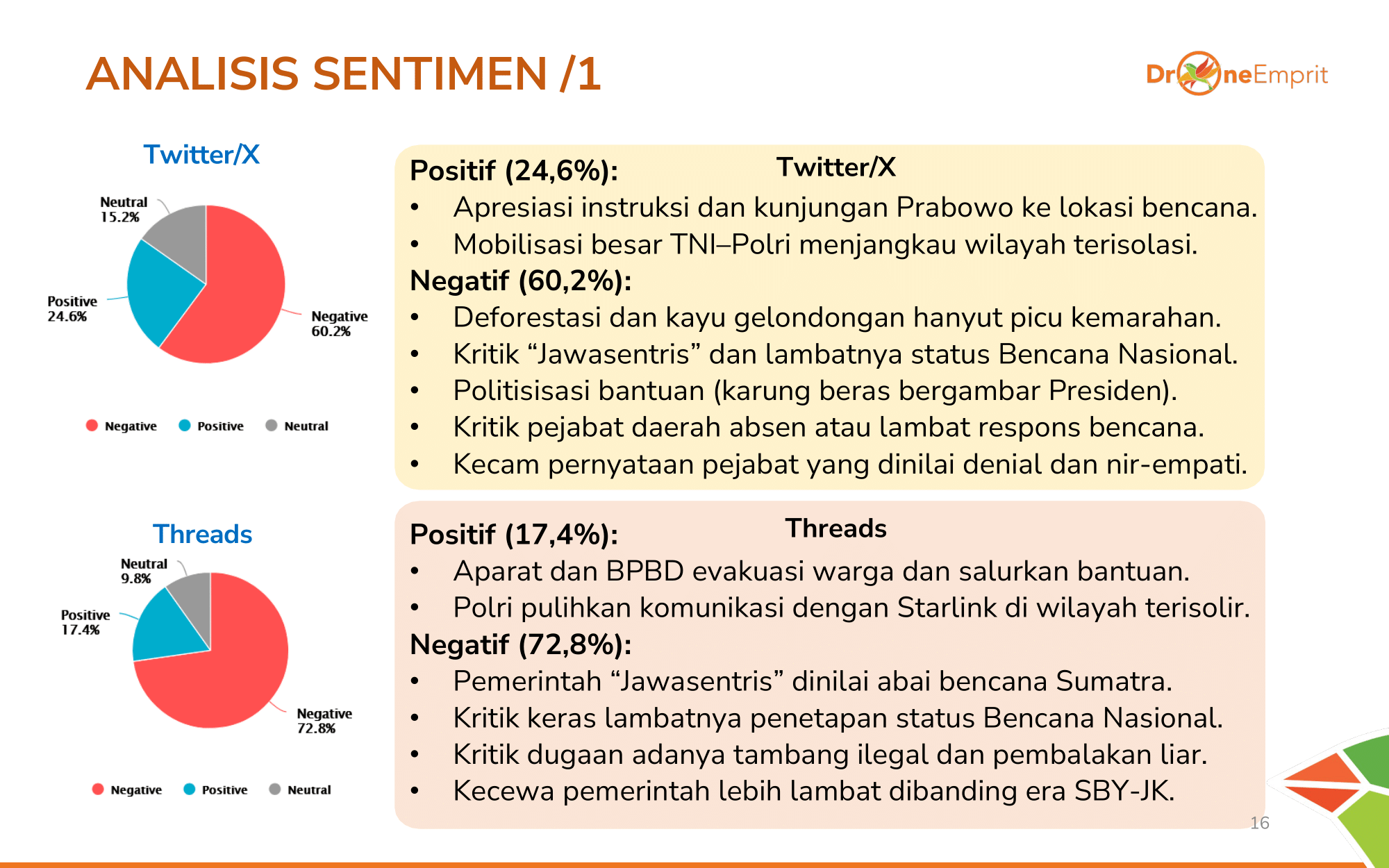 X & Threads didominasi sentimen negatif. Isu utamanya seragam: Kemarahan soal deforestasi (kayu gelondongan), politisasi bantuan, narasi ketimpangan "Jawasentris", & lambatnya penetapan status Bencana Nasional.