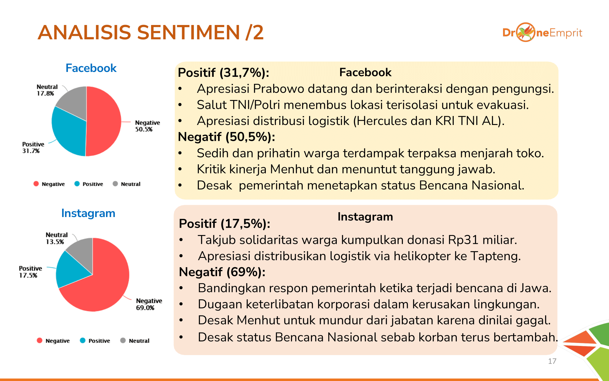 FB mengapresiasi kehadiran fisik Prabowo. Namun IG dominan negatif, menyoroti ketimpangan penanganan dibanding Jawa & desakan agar Menteri Kehutanan mundur.