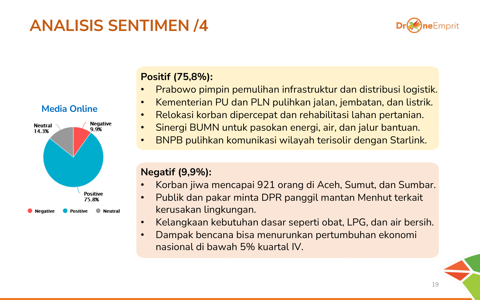 Terjadi polarisasi: Media Online dominan positif soroti aksi pemerintah & BUMN. Namun, Medsos justru memanas dengan sentimen negatif yang menyoroti deforestasi, lambatnya bantuan, & isu ketimpangan penanganan regional.