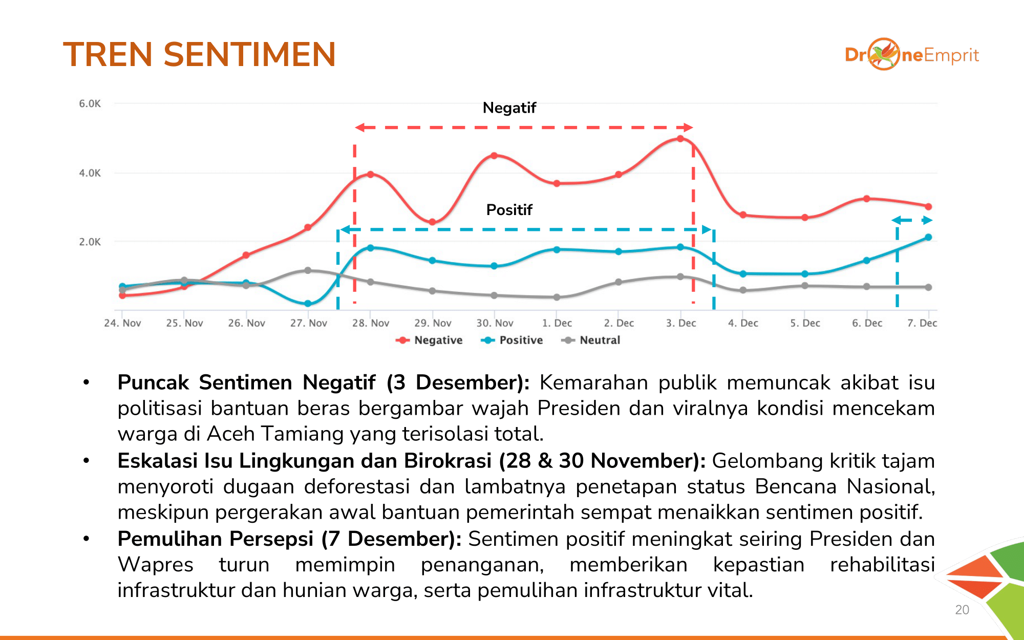 Sentimen negatif memuncak 3 Des akibat isu politisasi bantuan & viralnya kondisi warga. Tren mulai membaik per 7 Des saat pemimpin negara turun langsung memberikan kepastian rehabilitasi hunian & infrastruktur.