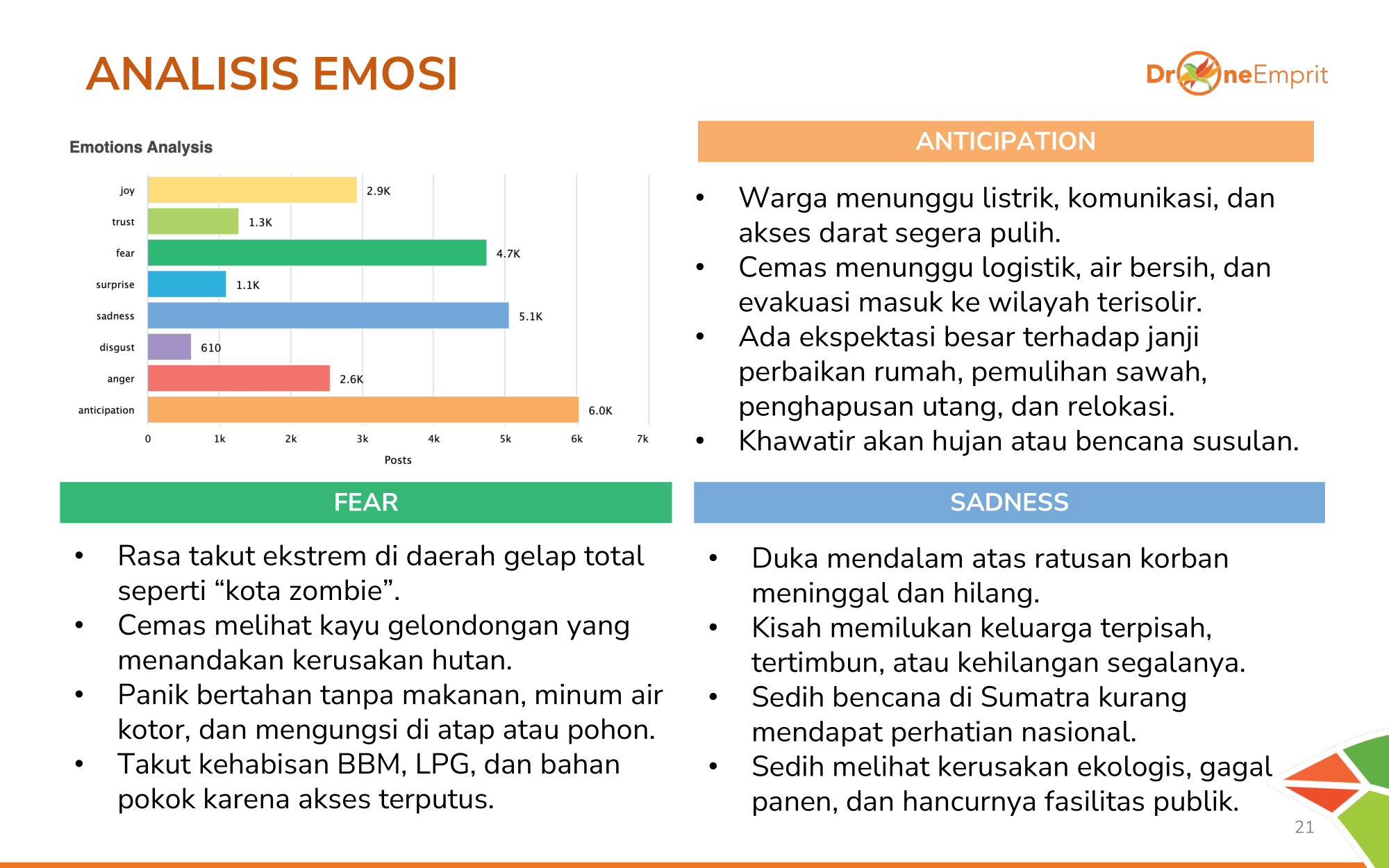 "Fear" & "Sadness" tinggi: ketakutan warga di "kota mati" tanpa listrik & duka mendalam atas korban jiwa. "Anticipation" paling tinggi menanti realisasi janji pemerintah soal perbaikan nasib mereka.