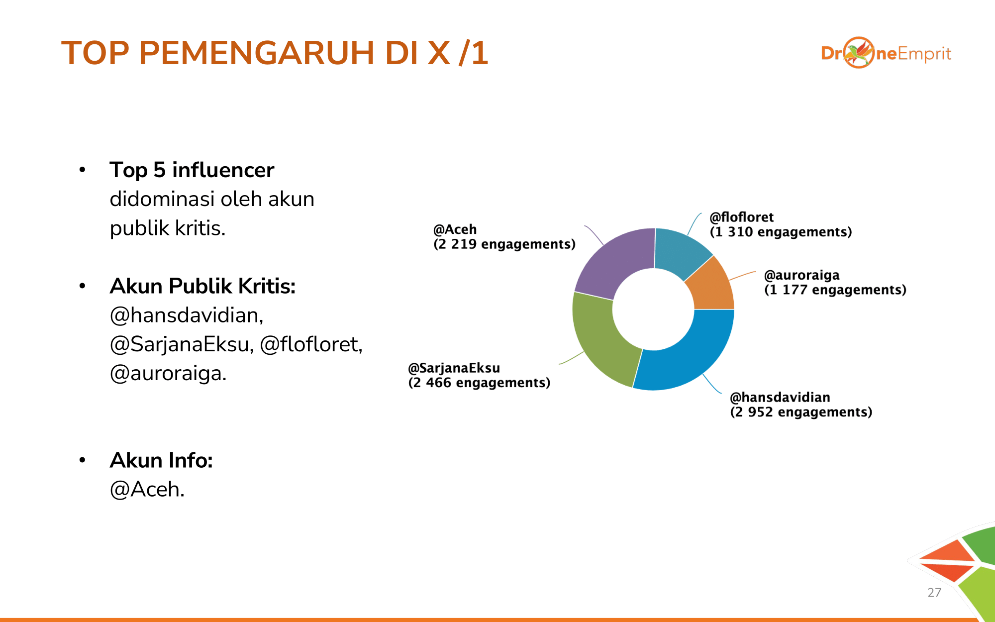 Percakapan di X dikuasai oleh akun publik kritis seperti @hansdavidian yang vokal menyuarakan isu lingkungan & ketimpangan, serta akun informasi regional seperti @Aceh yang update kondisi lapangan.