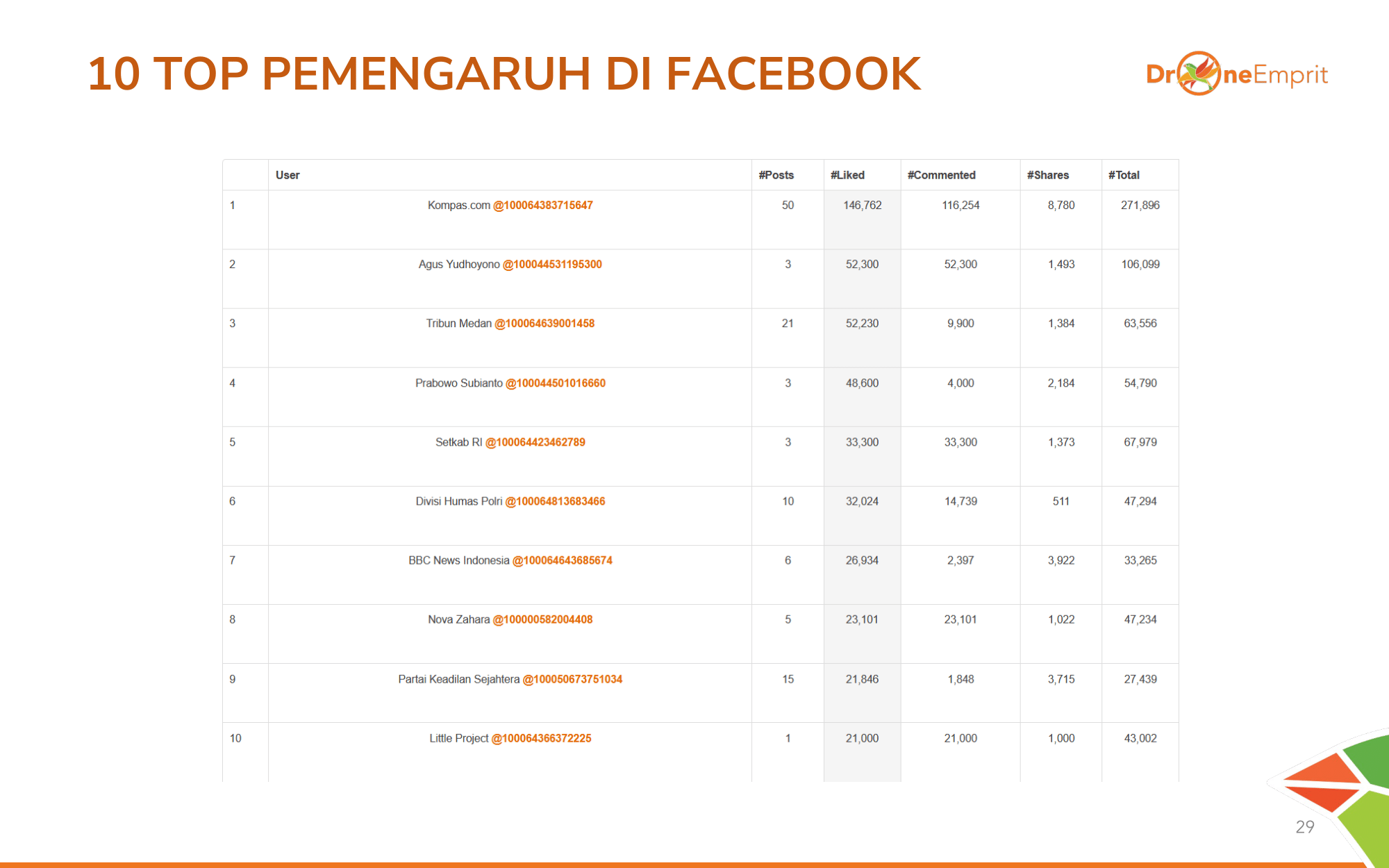 Facebook dikuasai akun Media & Pejabat. Berbeda dengan X yang "panas" oleh akun anonim, di sini Prabowo mendominasi interaksi lewat update resmi kegiatan pemerintah. Kolom komentar jadi ruang adu argumen warga.